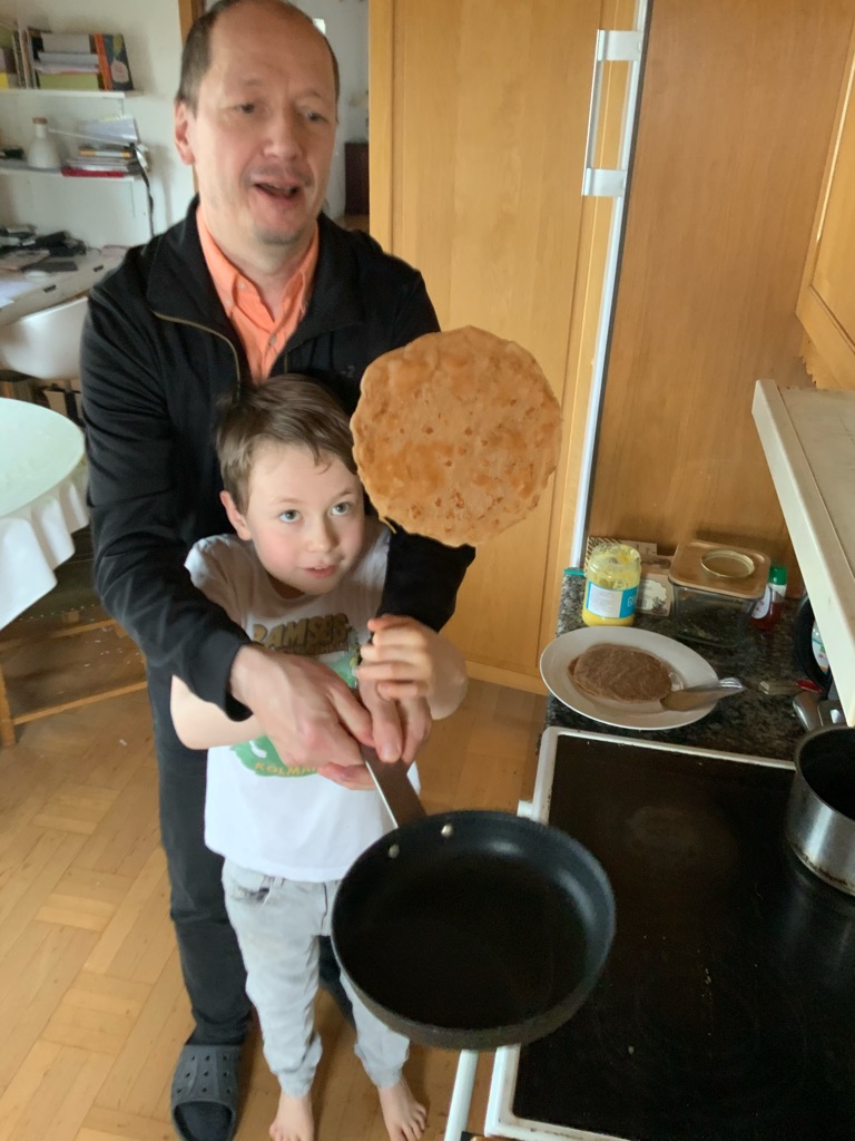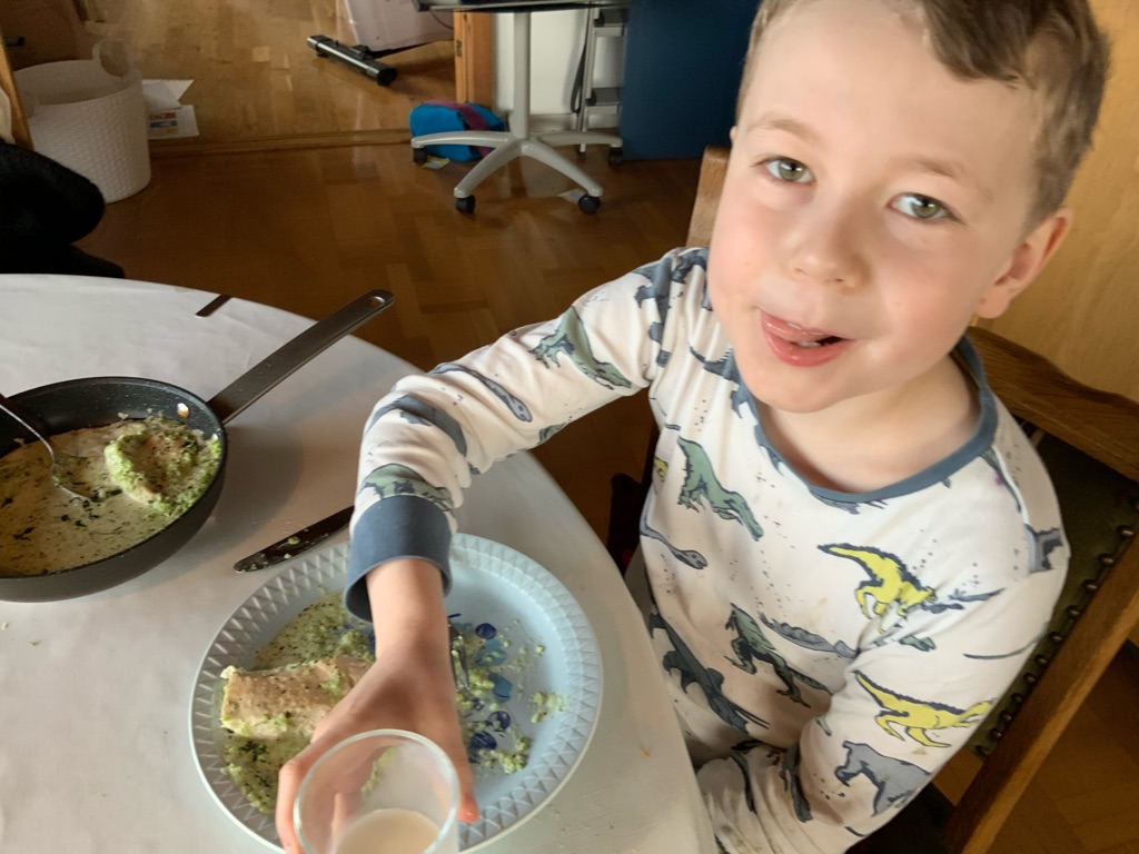 Jag undvek pannkakor denna morgon och tänkte på igår när Maynard åt upp pappas portion pannkakor. Han fick helt enkelt en överdos pannkakor. Kanske är det bra för honom att variera frukosten lite bättre än vad vi hittills gjort de senaste månaderna. Att ge Maynard varje dag pannkakor kanske är en av vinterns stora källa till OCD utbrottet? Nu istället gav jag honom lax med sötpotatis och lunchpaketet blev skivad kyckling med brokkoli och konjak pasta till.