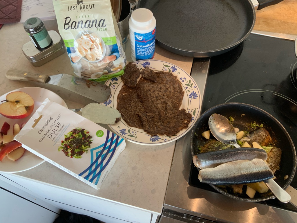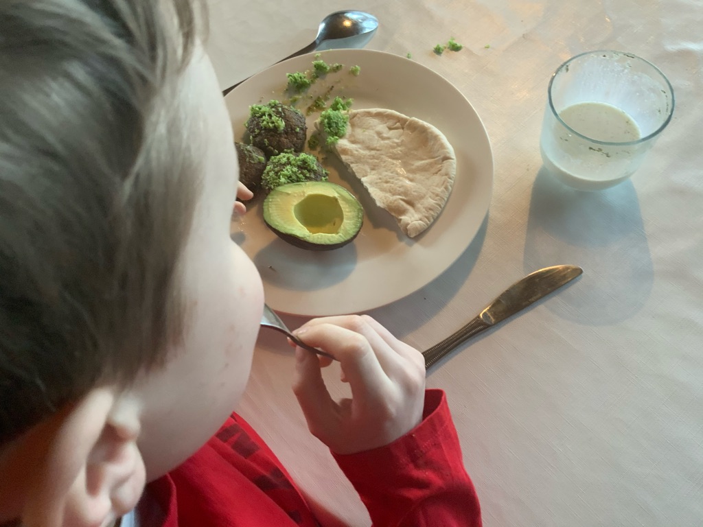Det var kanske inte så konstigt att jag försökte undvika kött idag, denna måndag. Maynard åt lax på morgonen och kyckling som lunchpaket. Pannkakor försökte jag också undvika eftersom jag misstänkte de inte var så oskyldiga och kanske bidrog till lindriga tics (eller OCD).