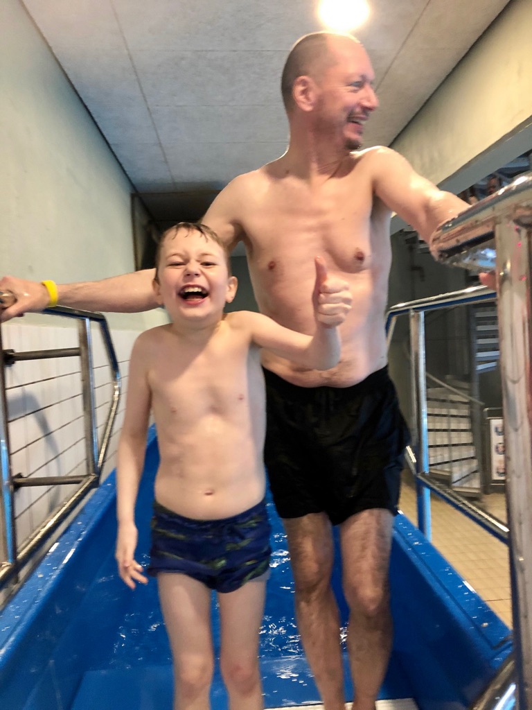 Han hade en tendens att skynda sig extremt mycket både på morgonen och på eftermiddagen. Som tur var gick vi och simmade tillsammans så han fick utlopp för energin. Väl inne vid entrén i simhallen såg jag en stark vilja att vilja på in i personalens kök. Han letade efter mat eller bullar.