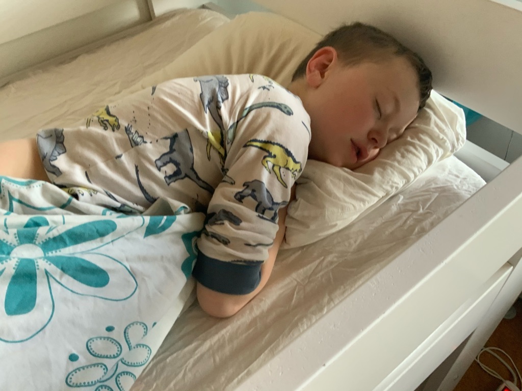 Så inleds den nya veckan med trötthet hos både mig och Maynard. Han sover fortfarande i vår dubbelsäng trots att vi tänkte i flera dagar att han skulle gå tillbaka till hans egen säng. Det betyder jag själv får mindre sömn. Ofta vaknar han mitt på natten och är kissinödig. Omsorgsfullt lägger han skinn duken från Castor oljan på sängen innan han kissar i stora mängder kiss. För det mesta somnar han om men inte alltid.