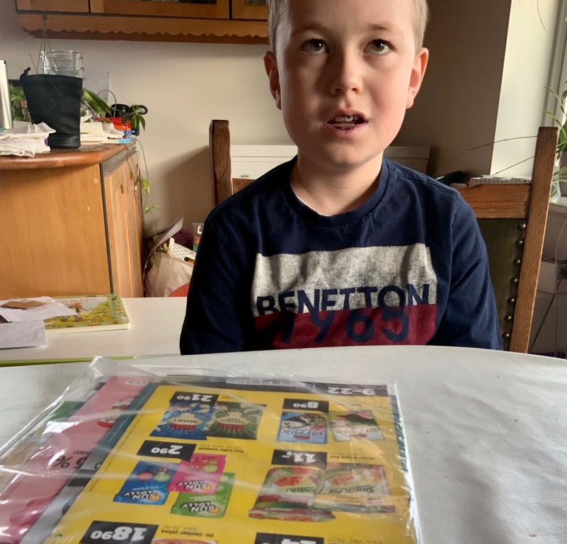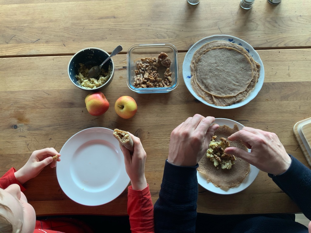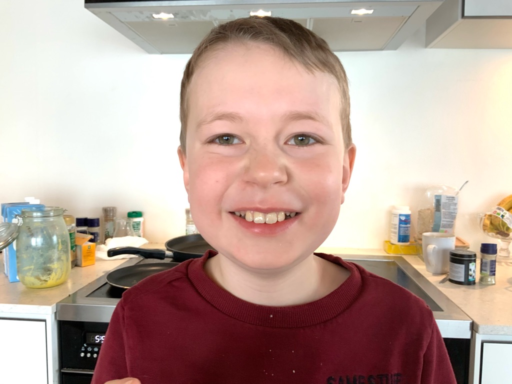 Feuerstein inspirationen kändes närvarande hela dagen igår lördag. Vi började med att planera pannkakorna på papper och skrev upp åtta punkter. Det verkade som om Maynard inte alls hade något emot detta. Tvärtom han var ganska ivrig och skrev med förvånansvärt säkra fast stora bokstäver bananmjöl och andra ingredienser. Han ville jag skulle hjälpa honom med handen. Jag försökte uppmuntra honom att göra bokstäverna själv för jag har märkt han har dåligt självförtroende. Efteråt blir vi båda förvånade hur fina bokstäverna blev med raka streck och mer eller mindre perfekta rundning på bokstaven ”A”.