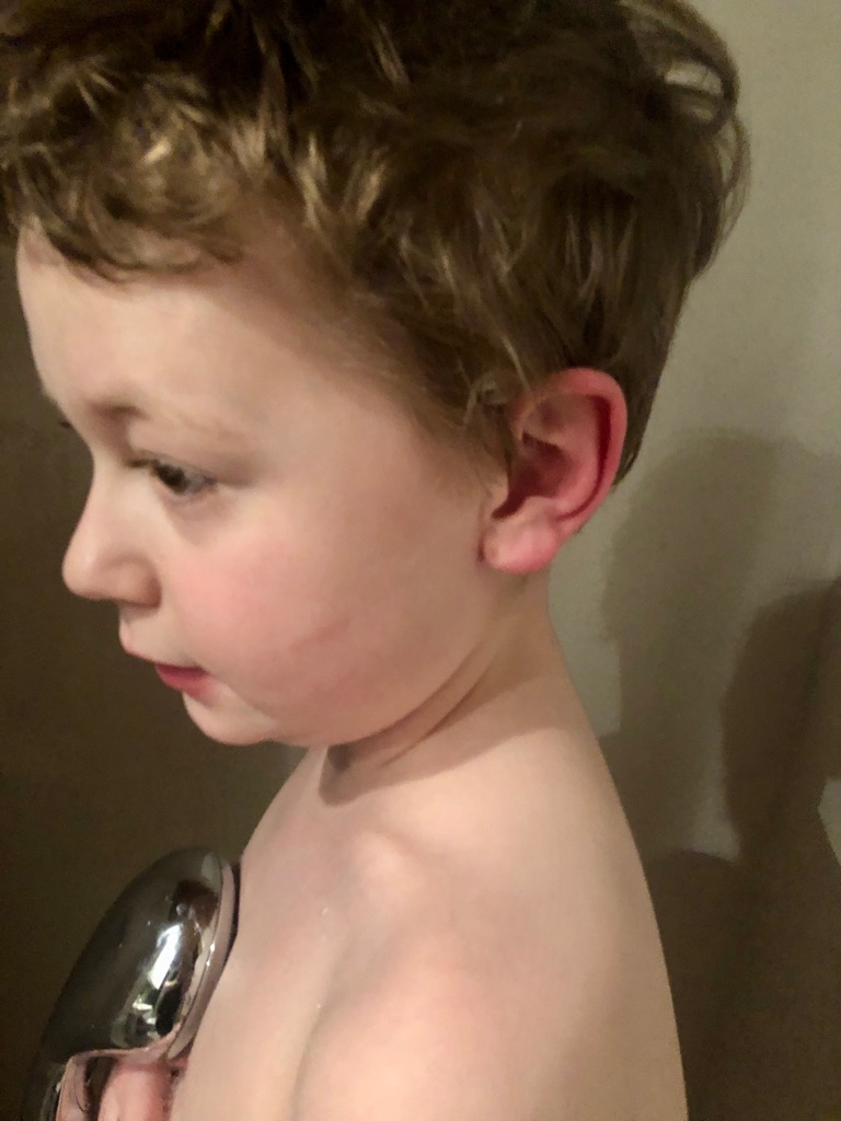 Nu när dagen har gått är jag inte längre så säker på att det är allergi därför utslagen påminner lite om samma han tidigare fått av de eteriska oljorna. Och inte nog med dessa utslag -- han fick dessutom några riktigt stora röda svullnader troligen av mygg från gårdagens tur i skogen.