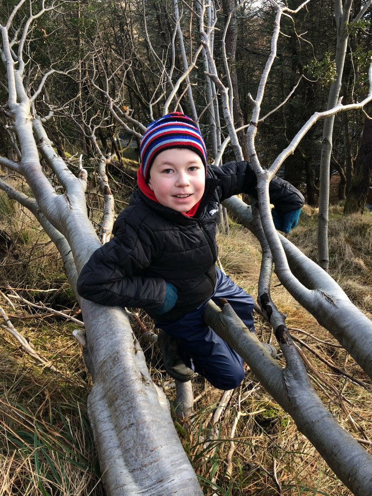 Maynard klättrade säkert på sitt favorit träd som nu är full av grönskande blad. Han till och med utforskar en gren ovanför och jag står spänt alldeles nedanför. Ingen stress och inga mobildevices. Inga avtalade tider så vi har inte alls bråttom. Bara brisen från vinden och träden starka och lugna närvaro.