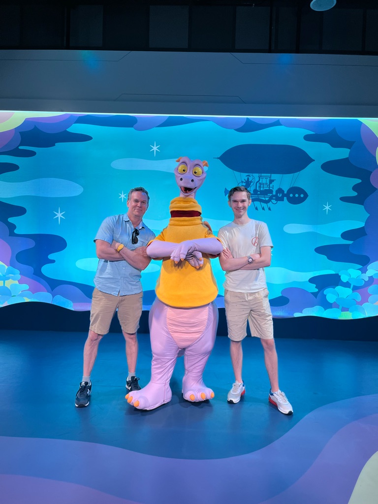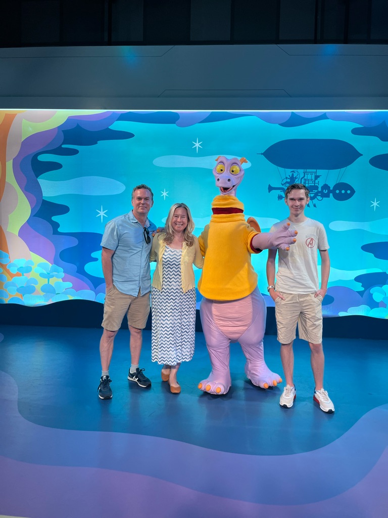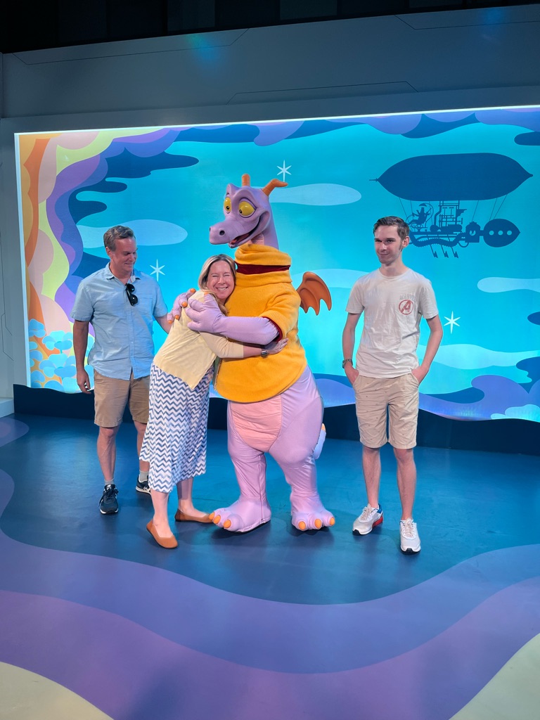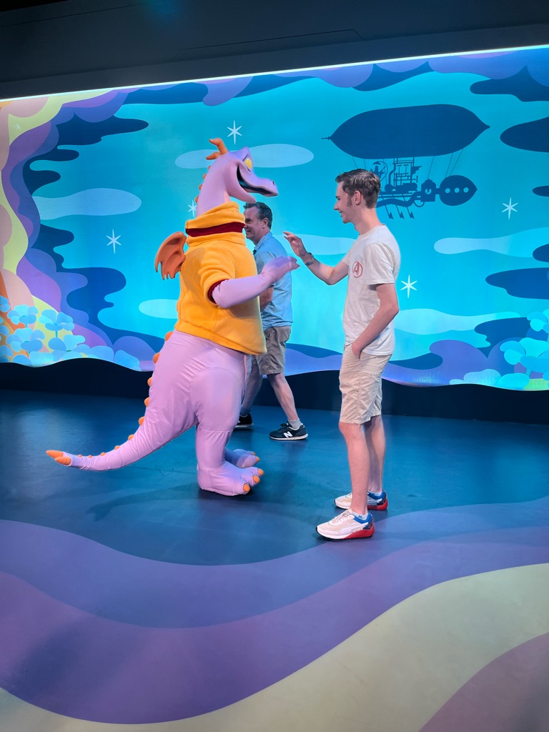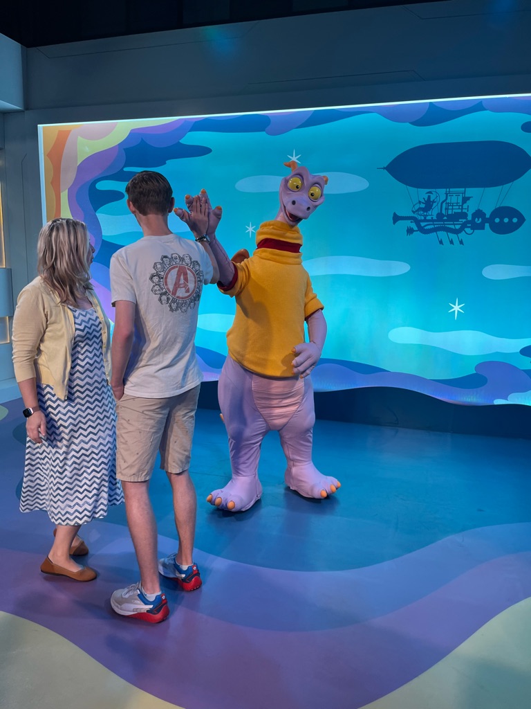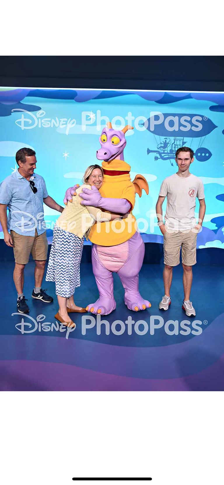 He left the room at 8 AM to get into the 8:30 early entry to Epcot. We went on Soaring first and basically walked on! Then we went to take pictures with Mickey and friends… A fun tradition that I’m happy the boys still indulgence us with 😊. Then we explored the new Moana water area, which was fun. Then we went on Nemo and then on Living with the Land (and we walked on both of those). We also walked onto Figment and realized they were doing pictures with Figment! He was just finishing up his first greeting time, so we went to the Pixar short film attraction, and then got back in line to grab a elusive picture with figment 🎉😊