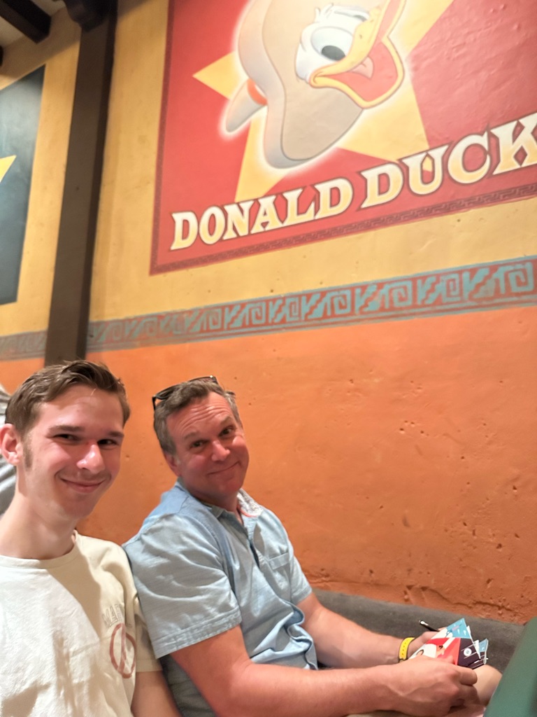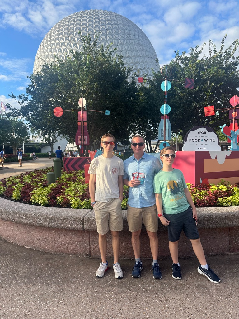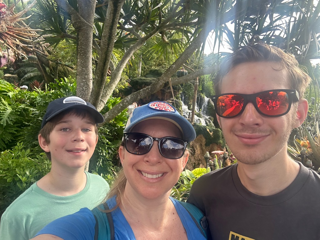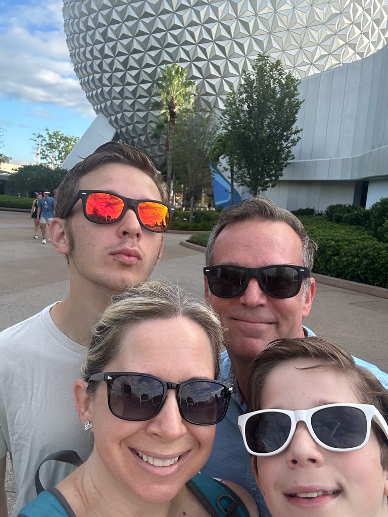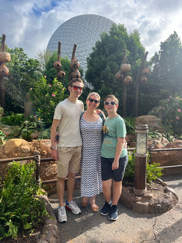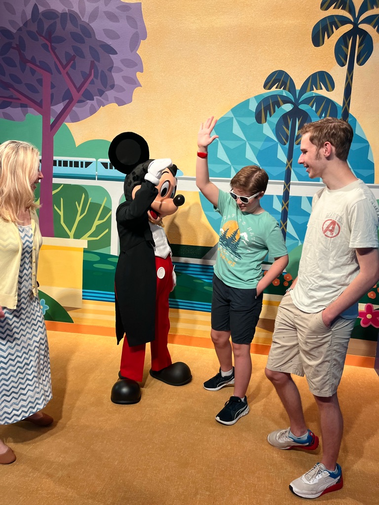 He left the room at 8 AM to get into the 8:30 early entry to Epcot. We went on Soaring first and basically walked on! Then we went to take pictures with Mickey and friends… A fun tradition that I’m happy the boys still indulgence us with 😊. Then we explored the new Moana water area, which was fun. Then we went on Nemo and then on Living with the Land (and we walked on both of those). We also walked onto Figment and realized they were doing pictures with Figment! He was just finishing up his first greeting time, so we went to the Pixar short film attraction, and then got back in line to grab a elusive picture with figment 🎉😊