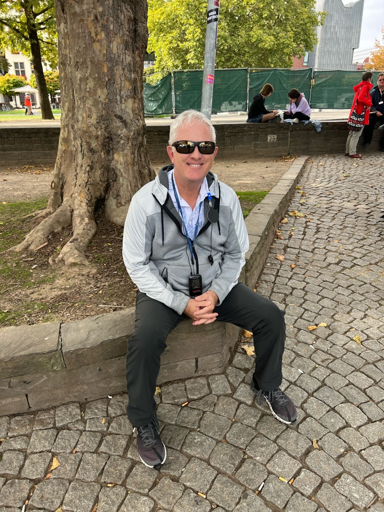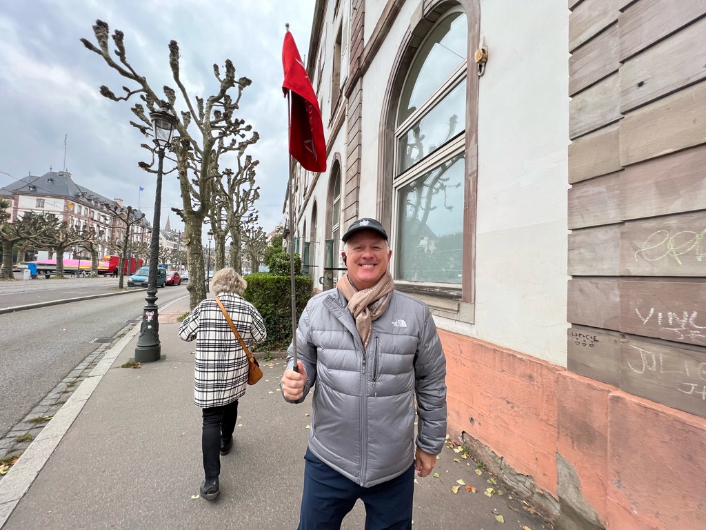 We headed into the old city of Strasbourg. Our guide, in the plaid coat, handed Tom the flag and he was instantly transformed into the group leader!