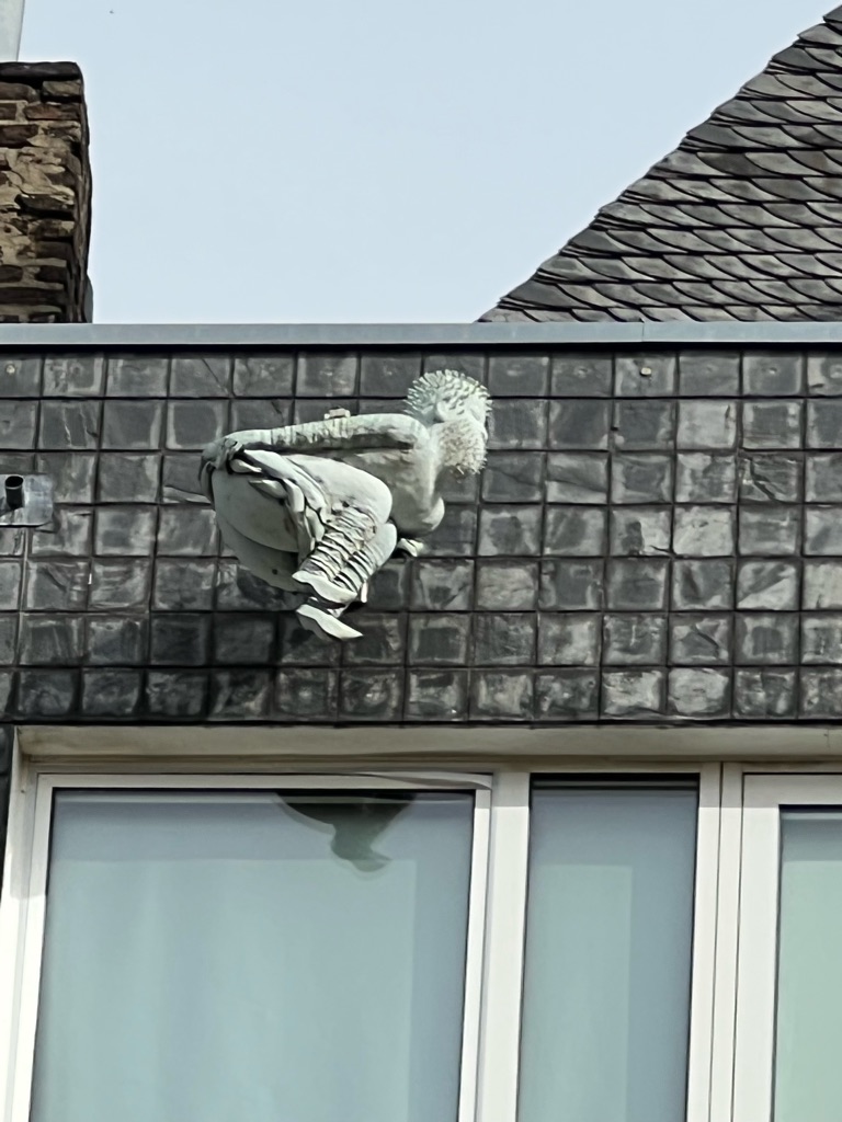 This statute, called Kallendresser, \240is located at the top of a 5 story building on the old market square. It depicts a rather naughty boy with his pants down …. Either mooning the cries of perhaps taking a poo! The rumors abound! The original statue was carved in wood hundreds of years ago but was later destroyed. This version cast in bronze was carved by Edward Mantare in 1956.