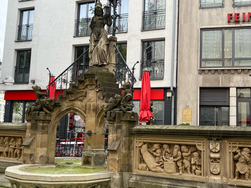 We came across this figure in a small square close to the cathedral. It is Statue of the Schneidersfrau (woman of the tailor) on top of the Heinzelmaennchen fountain. The Heinzelmännchen is an old German tale about little gnomes that did the work of the citizens of Cologne Germany during the night so the citizens could be lazy during the day. Eventually the tailor's wife (Schneidersfrau) scattered peas onto the floor to make the gnomes slip and fall. The gnomes disappeared and never returned. You may have heard of a similar story in the Grimm’s Fairytale \240Elves and the Shoemaker.