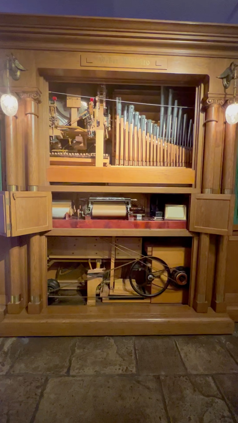 This violin and piano cabinet is one of only 6 left on existence. Five of them are in the museum. This one has 6 violins, each one with a single string. Queen that note is needed, the violin is pushed forward into the rotating bow. Most of the machines in the museum are played using paper that is punched with holes that drives the different mechanical instruments.