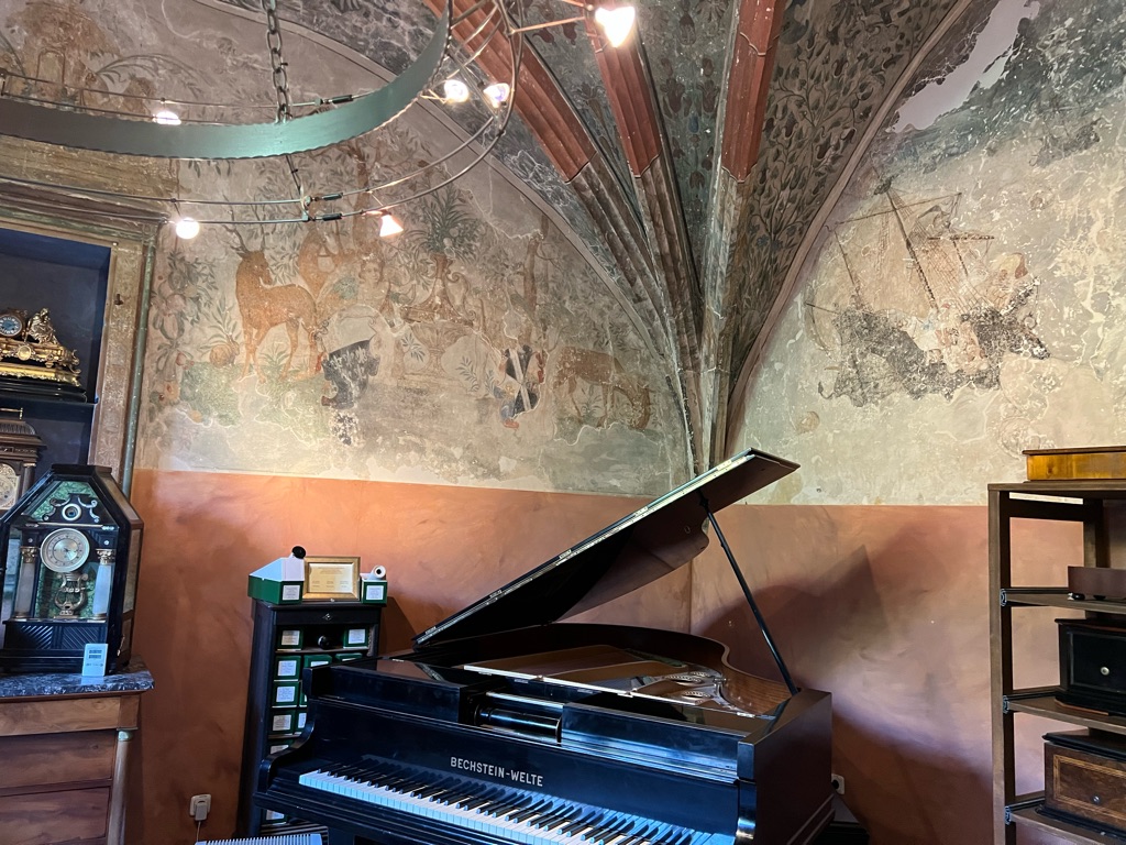 The building that houses the museum is one of the oldest in town and the murals on the walls are from the 1500s. The tiles on the floor of the next room, which has been a chapel, were from the 1200s. The player piano is a much younger addition, though.