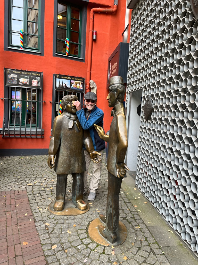 Willis has found the two local inhabitants of Cologne’s Old Town. , These two bronze statues, Tünnes and Schäl, are legendary figures from the Hännes Dolls’ Theatre. The noses of Tünnes and Schäl have been rubbed until they are shinny \240gold as that is supposed to bring you good luck.