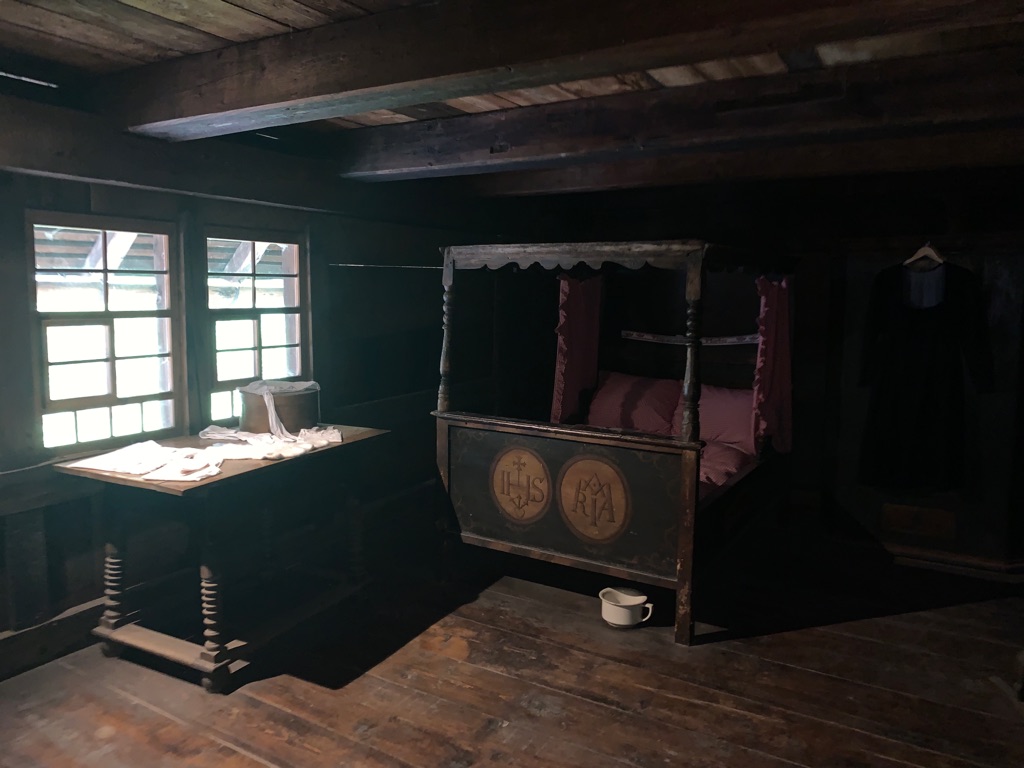 Interestingly, this small canopy bed is the “family” bed. \240Back in the 1600s, people slept sitting upright and the entire family, parents and children, slept sitting up in the bed together. The heavy canopies would keep the occupants warm at night, and if it got to hot, you could pull a cord and vent the top. Our guide said that apparently people thought that if you slept laying down, too much blood would rush to your head and cause you to go insane. But babies could sleep laying down safely, so they got their own cradle.