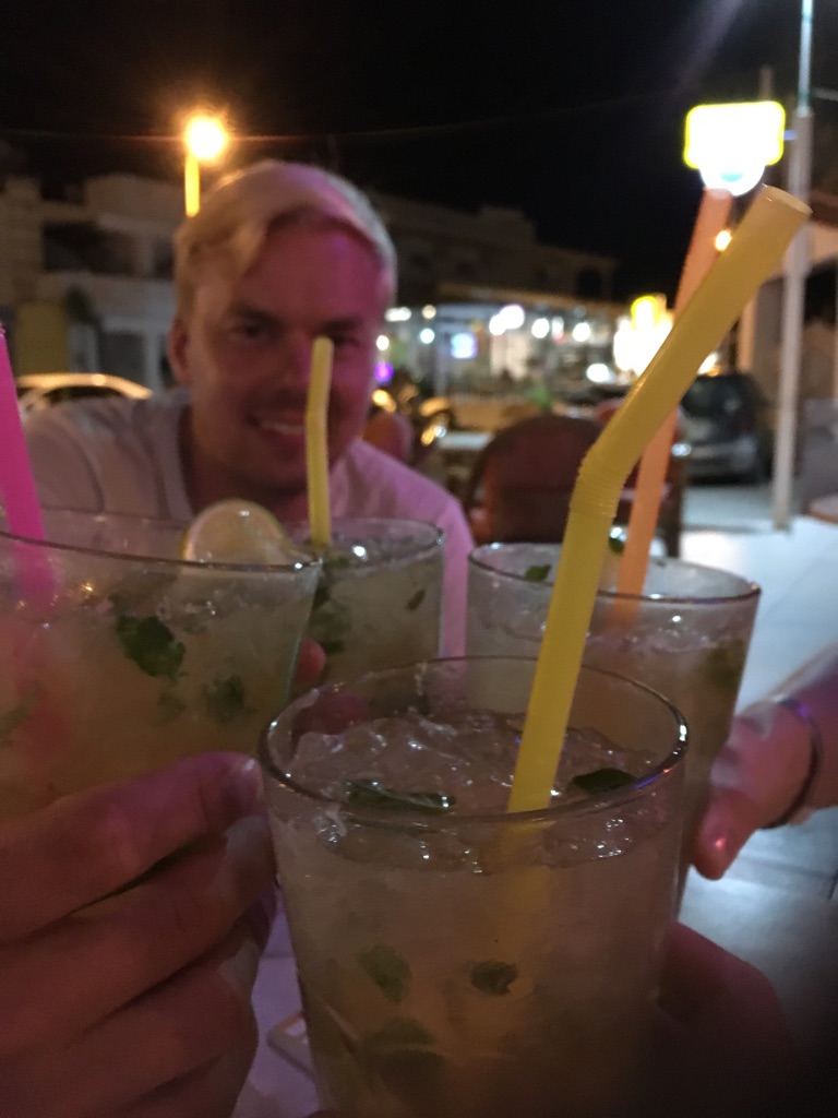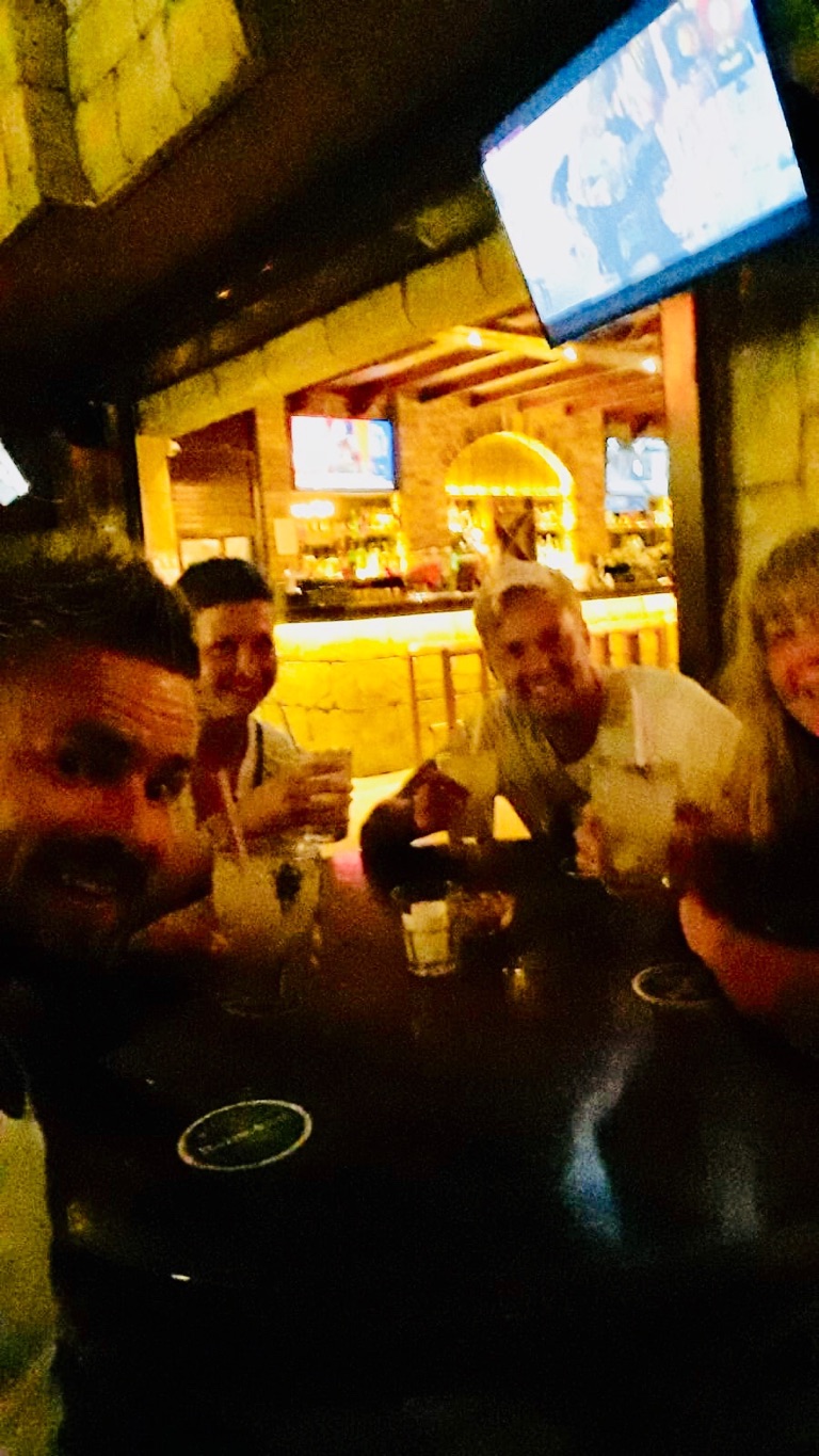 Kentällä aamupalan jälkeen ekat juomat. Eihän me muut, mutta kun Matti näytti esimerkkiä (klo 6:15)😀 Tästä se loma alkaa.