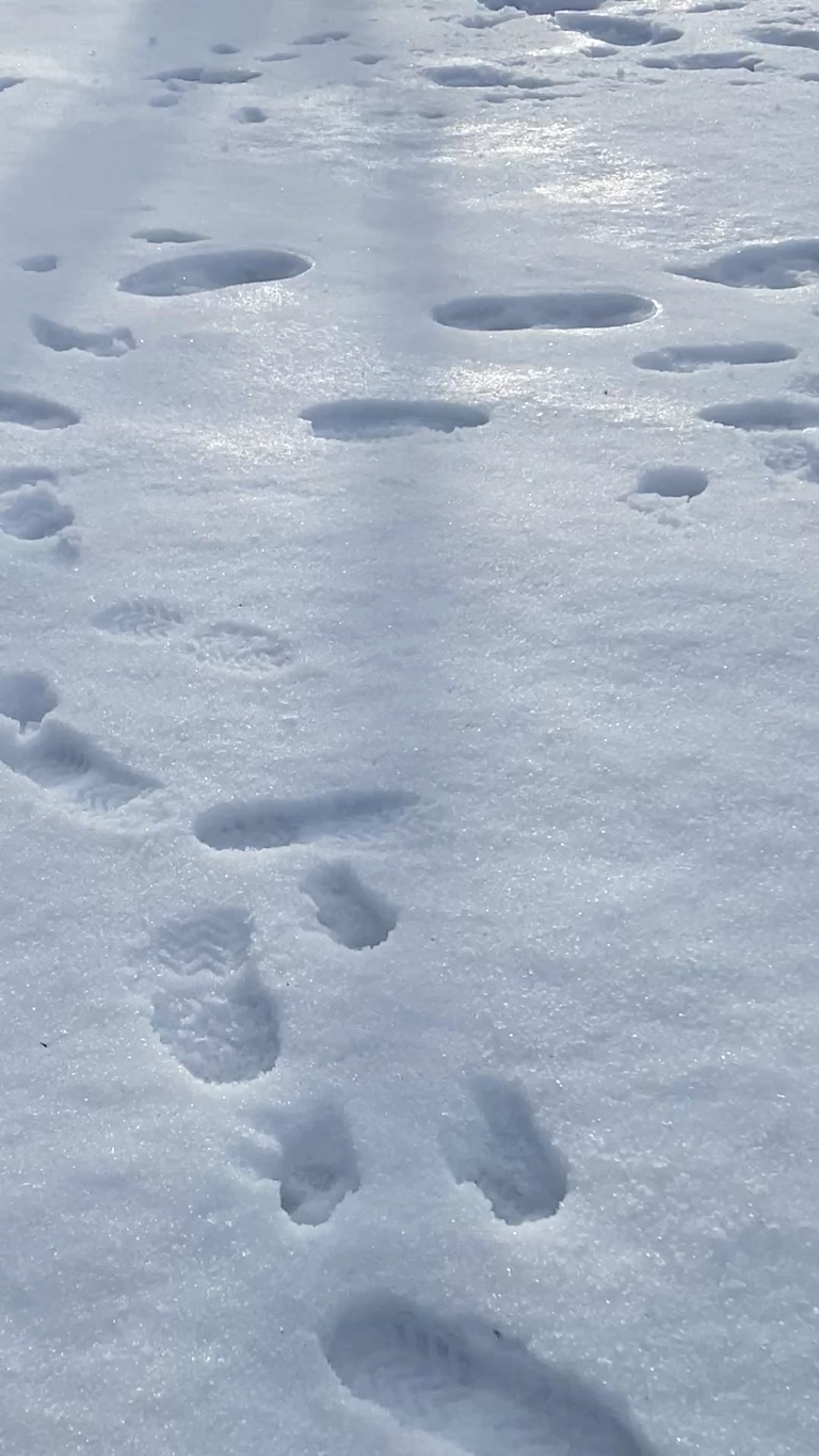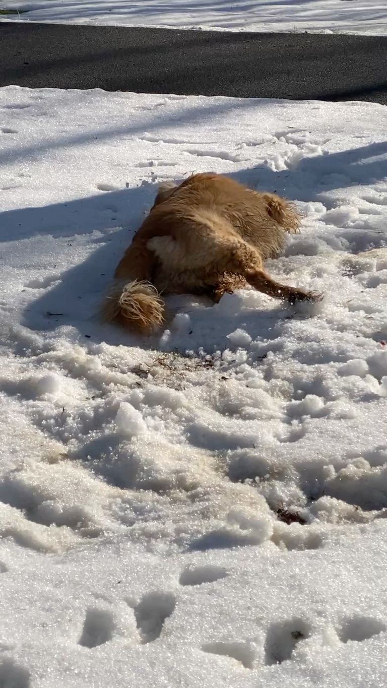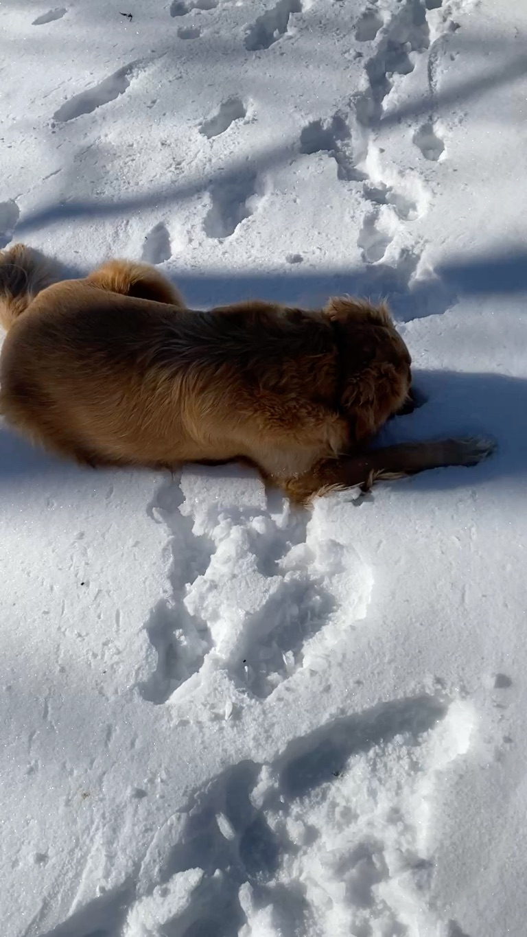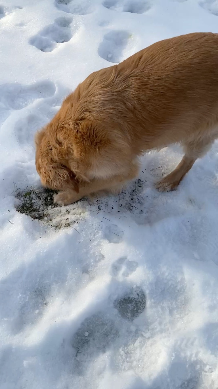Going for a little walk around the yard. I really like the snow, even though little pieces of frozen snow get stuck in my paws!