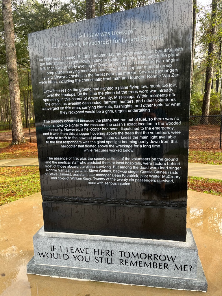 This is the site where their charter plane ran out of fuel and crashed in 1977, killing four members, including lead singer Ronnie Van Zant. Mississippi locals saw the plane coming in and quickly mounted a rescue that save the lives of twenty people.