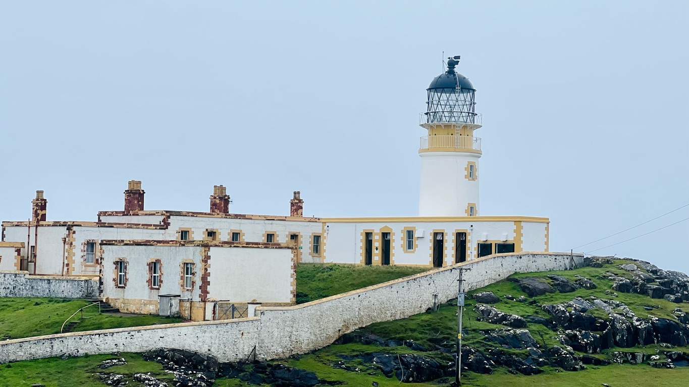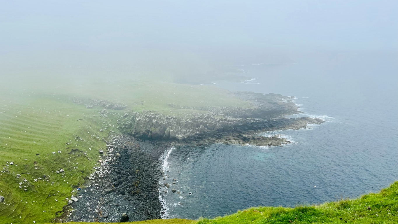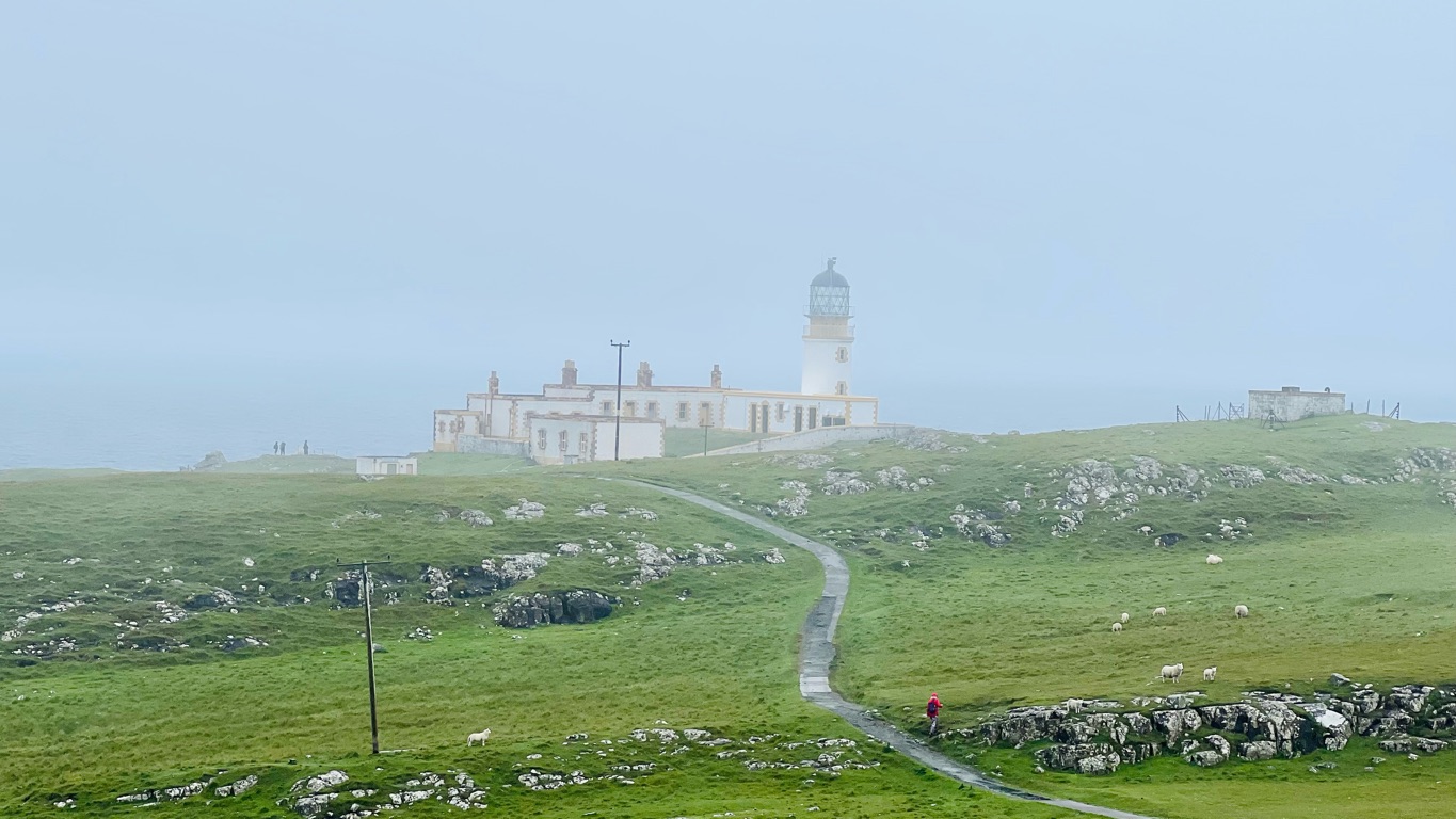 We then drove over to Neist Point on the tip of the island where a lighthouse sits. The fog was very, very thick, the winds were blowing hard and the rain had picked up. The trail from the car park to the lighthouse was seriously steep (hold onto the handrail the entire way down or you’ll slip and fall down). The rest of the gang stayed in the car while I went down. I was rewarded with some great views of the beach, some tall cliffs and a bunch of sheep of course. There’s more sheep than people here, they’re on every hill and field the whole time you drive around. They run across and along the roads also so you have to be really careful not to hit one. There’s no natural predators here so they’re not afraid of you or your car. The lighthouse was very pretty, the fog lifted once I made the steep drop down the hillside where the car park is.