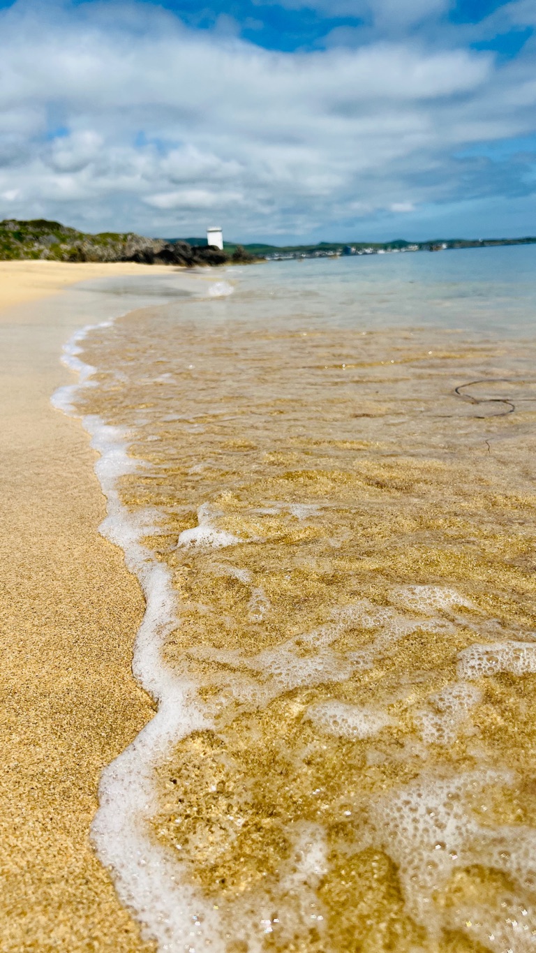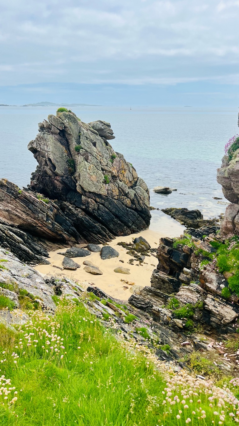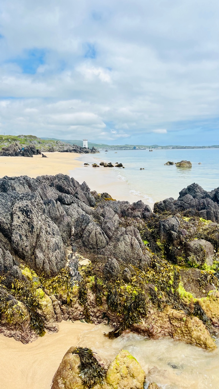 While he was doing his Laphroaig tasting Laura, Khrystyan and I drove to a lighthouse and beach about 20 mins away. It was absolutely beautiful! Perfect sandy beach (a bit rare for Scotland, doesn’t even look like a beach you’d think was in Scotland), with cool jagged rocks jutting up out of the sand. I kicked off my shoes, rolled up the pants and had a good time walking through the cool water.
