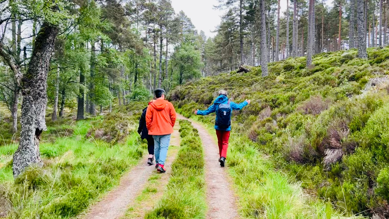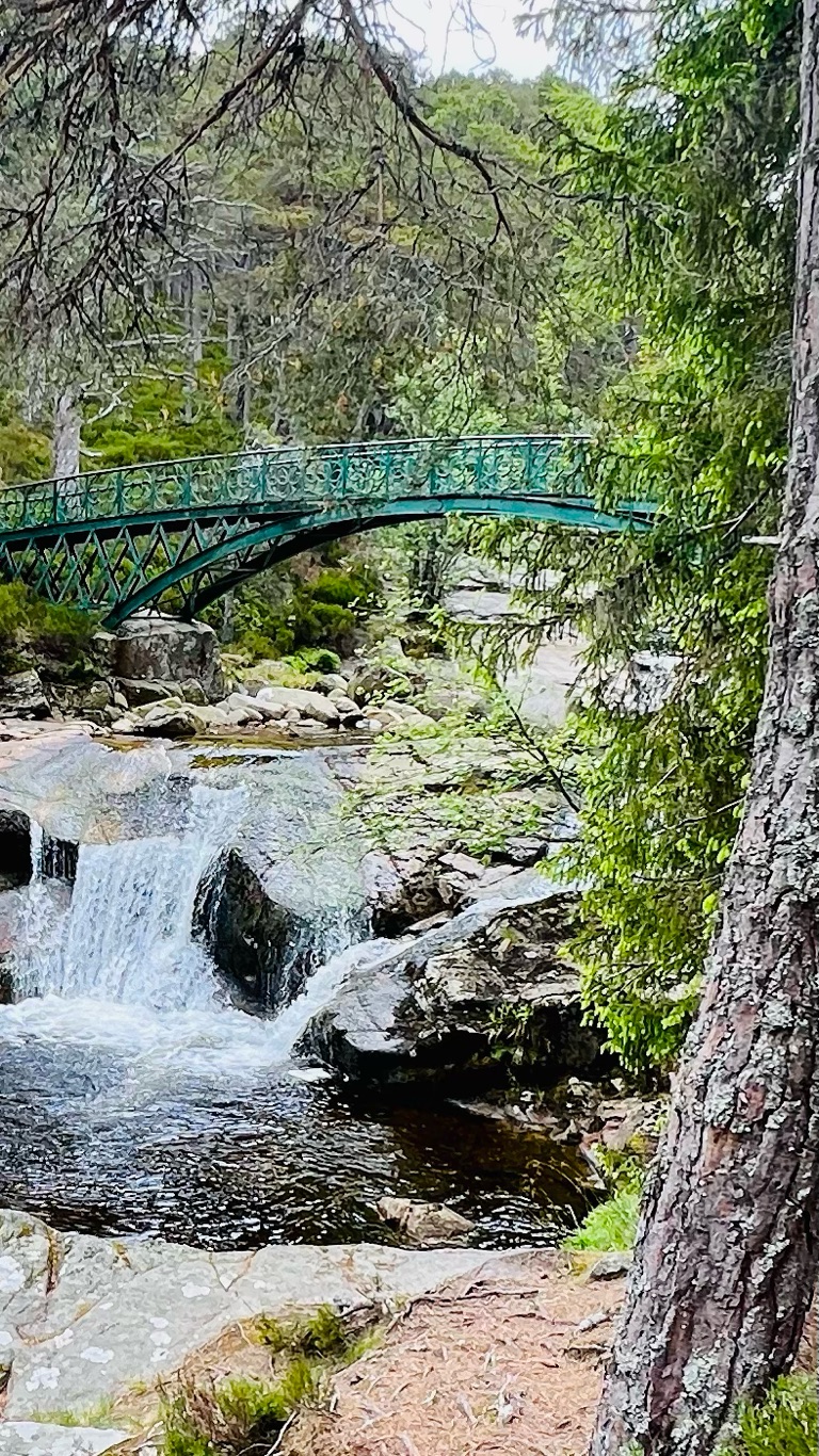 Once we arrive, we all get a cup of coffee and scone (pronounced “skoon” here; also the proper way to dress a scone is jam first, then butter fyi). We meet our guide Alan, an older gentleman with a soft voice and very thick Scottish brogue. He’s very friendly (as are all the Scots we’ve talked with) and has been mountaineering for 30+ years in the area. Alan took us up to a trailhead that started on public land, then quickly transitioned to Balmoral Estate land. We’re fairly near Balmoral Palace, the private summer getaway for the Royal family. Scotland has right to roam laws, and even the royals have been exceedingly gracious with allowing citizens to hike and roam on their lands. In return, the locals don’t go near the palace to give the Royal family their privacy- that is what they came here for after all. Even when they’re in residence at Balmoral, there’s no news crews, paparazzi or screaming fans waiting to catch a glimpse of the Queen or any of the Prince’s & Princesses. In fact, the trail we took was nearly empty, we only ran into a couple of other parties. The walk through the woods was a lot like home, but a little different and so beautiful. We hiked for about 5 miles in a large circle and passed a bridge built by Queen Victoria in the 1800’s overlooking a waterfall she loved and was very keen on watching, as well as an old hunting lodge near a dammed up river. The grasses are so vibrant, the heather and trees so beautiful.