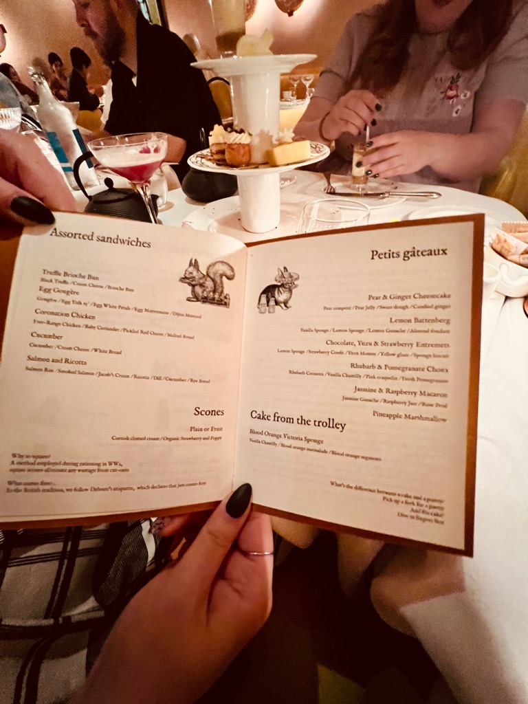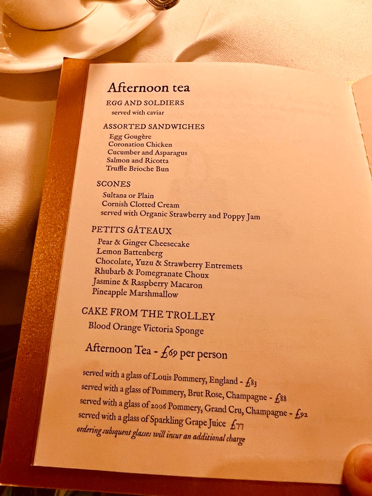 We then walked towards Trafalgar Square, through the Theatre District for some High Tea at a really fancy place called Sketch. I’m including the menu here because there was so many different kinds of food we had it’s impossible to remember. Really tasty, delicious tea, complete with a three piece string trio playing music. Very enjoyable and glad we were able to experience something like that.