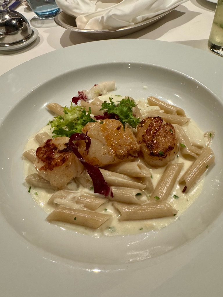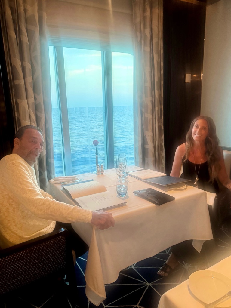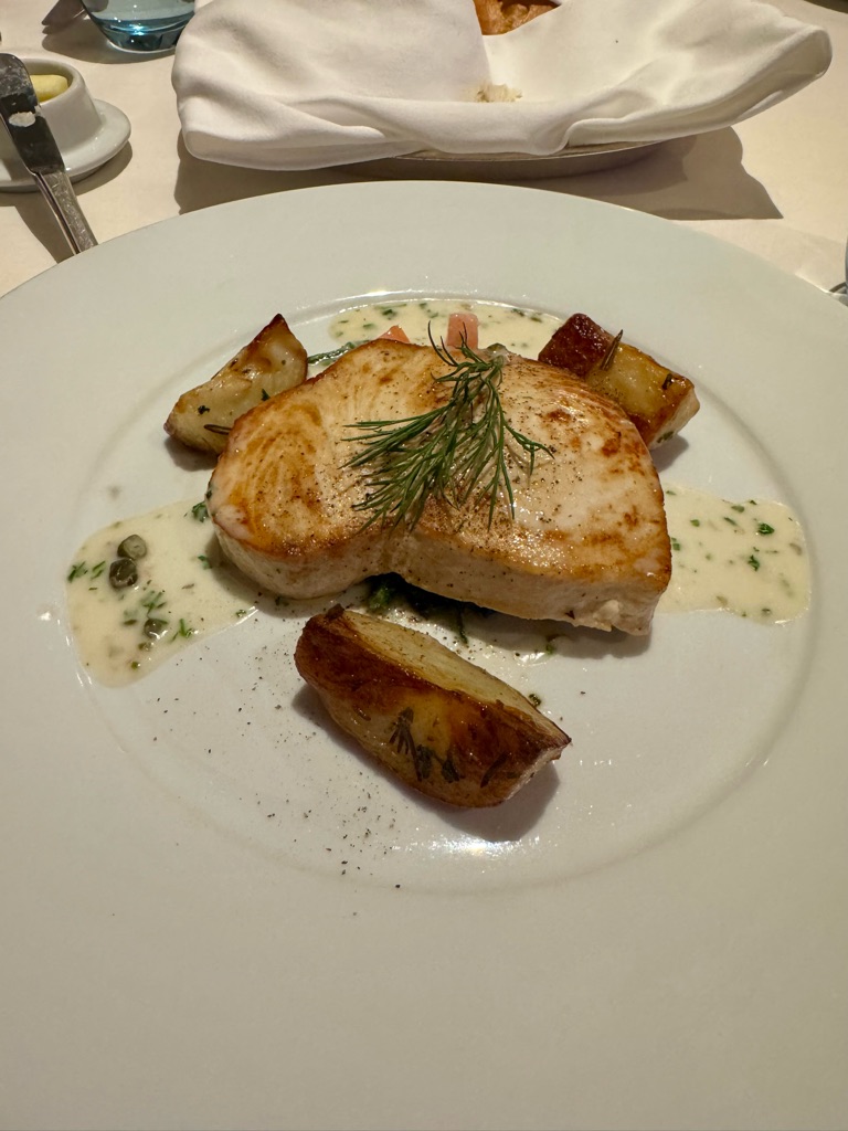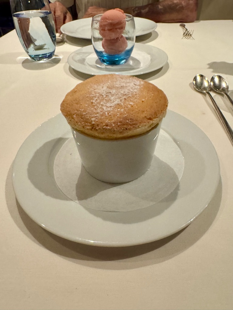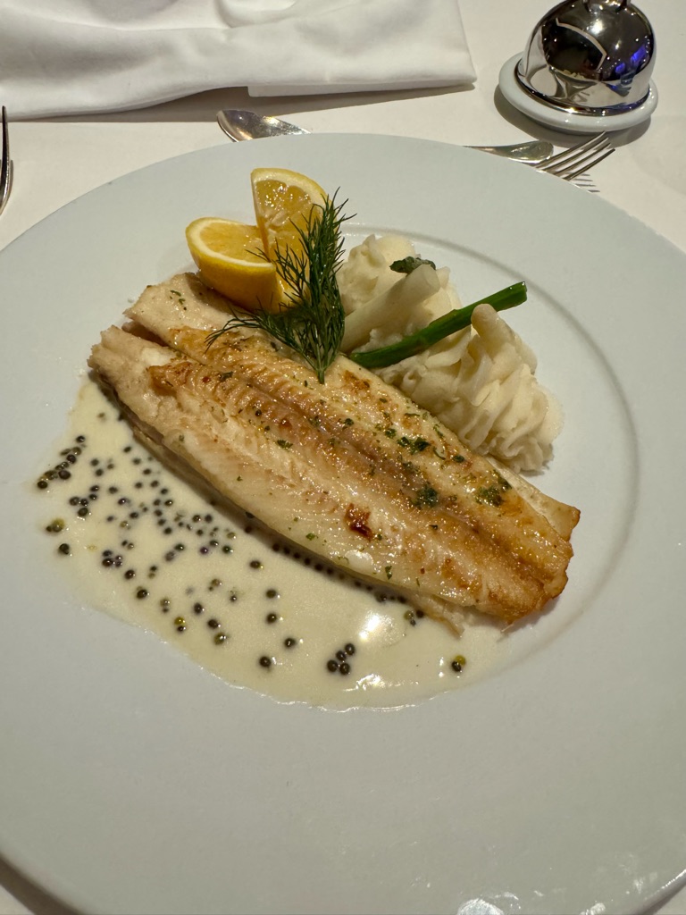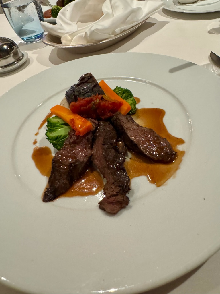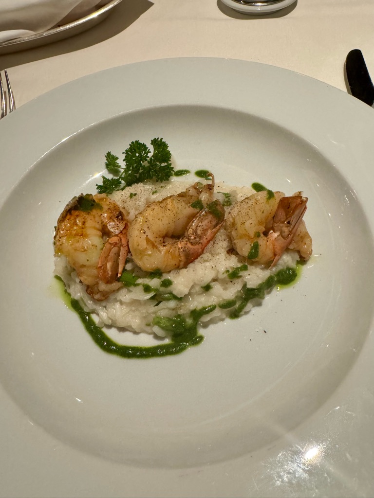 Tonight for dinner we went to Solis. It’s only the second time we’ve been there. Technically you’re only supposed to go once a week. It’s the restaurant that replaced Thomas Keller. It’s a Michelin star chef Mediterranean style cuisine. The food was amazing. Definitely much fancier than any of the restaurants in the ship, which is why they only let you go once a week. I had Poo 🔼 your base and Robert had Blank.