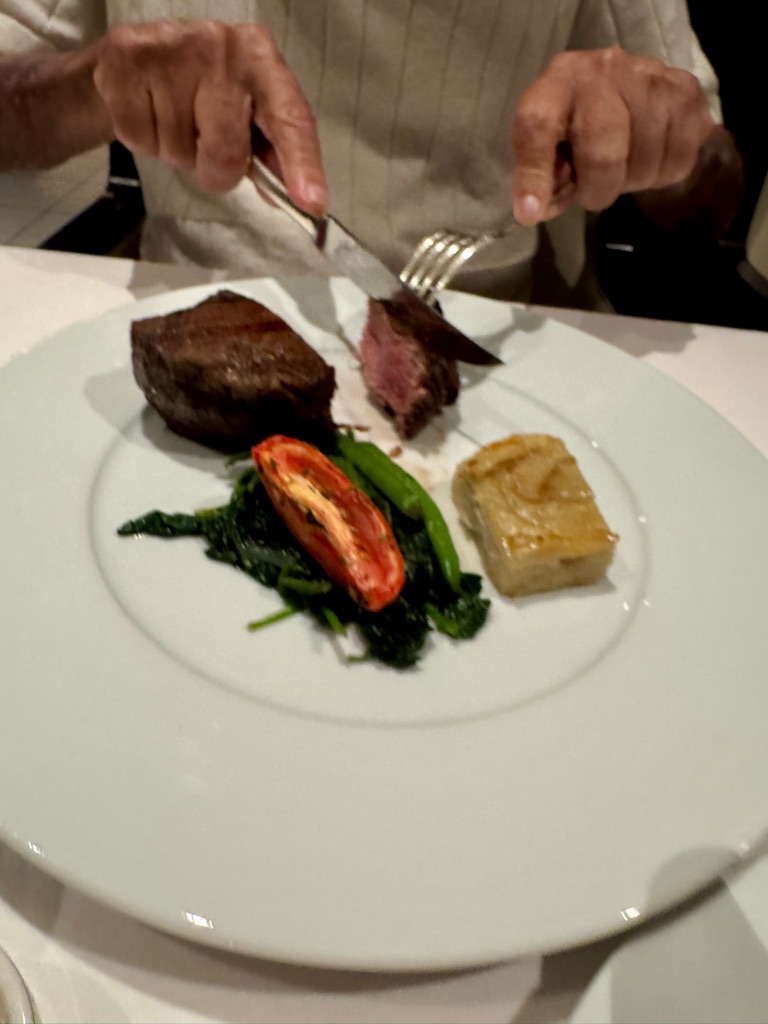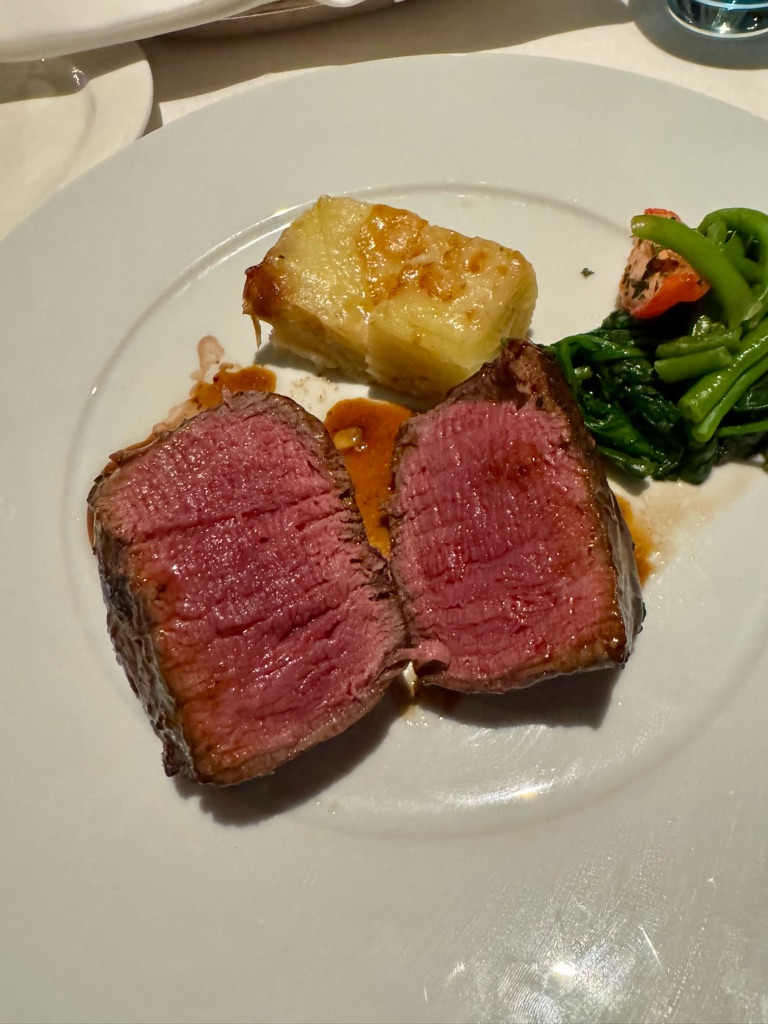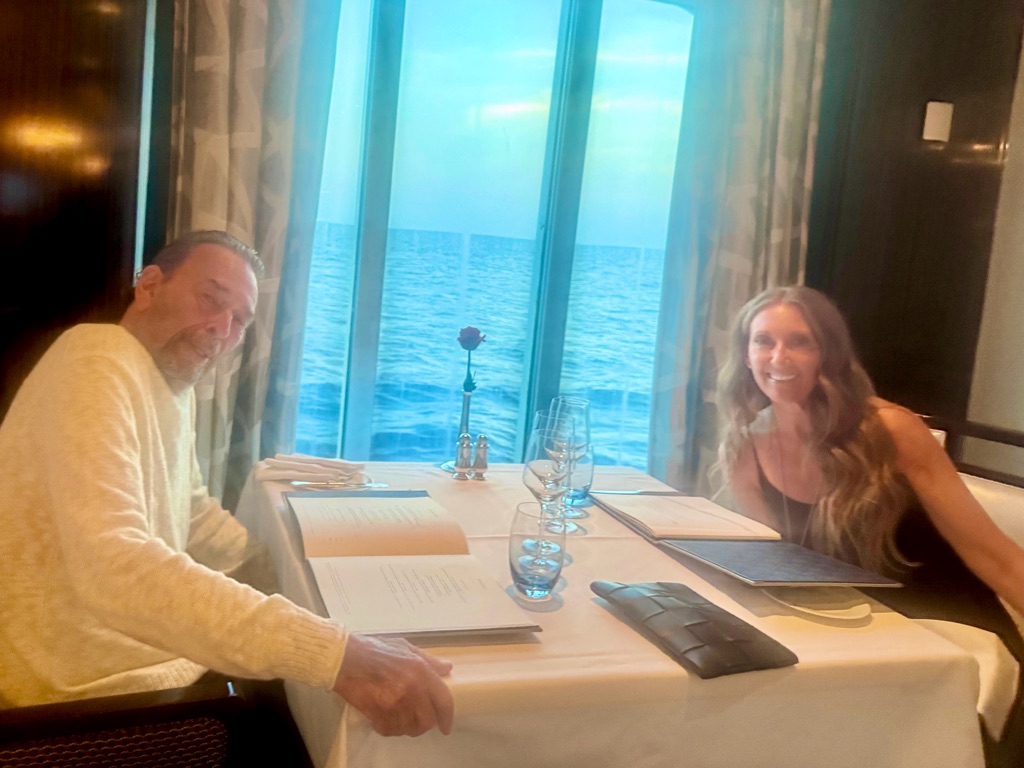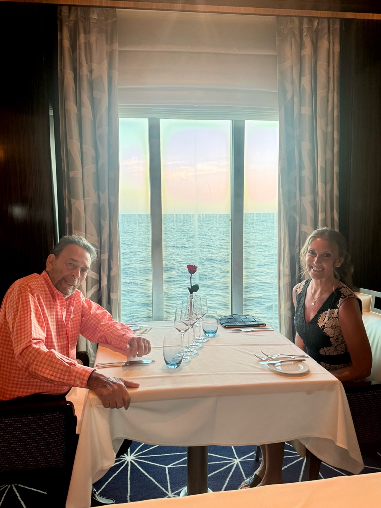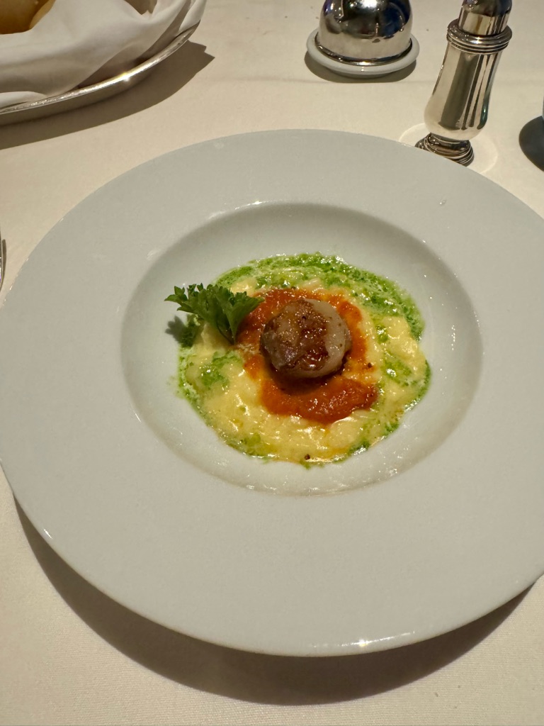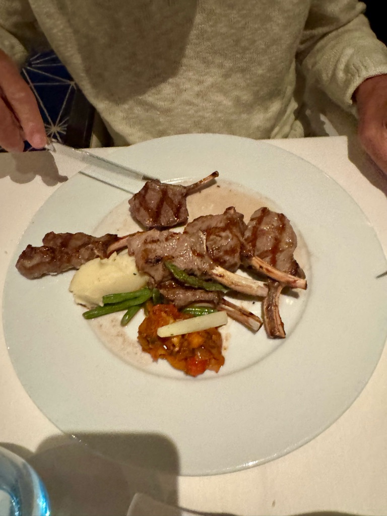 Tonight for dinner we went to Solis. It’s only the second time we’ve been there. Technically you’re only supposed to go once a week. It’s the restaurant that replaced Thomas Keller. It’s a Michelin star chef Mediterranean style cuisine. The food was amazing. Definitely much fancier than any of the restaurants in the ship, which is why they only let you go once a week. I had Poo 🔼 your base and Robert had Blank.
