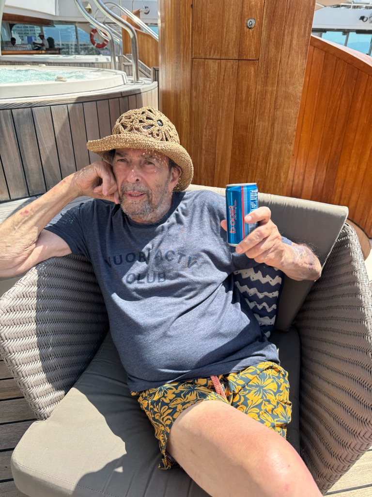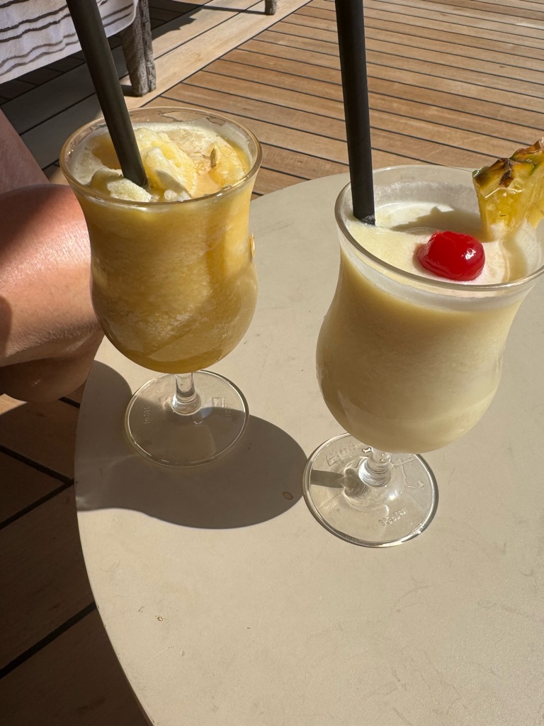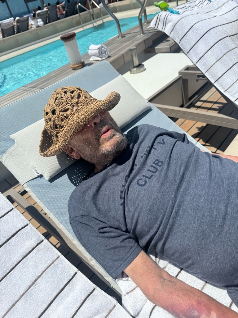 It actually rained today for the first time, but our lounge beds were covered so it didn’t matter. People were still in the pool in the hot tub, drinking their champagne. I went in the hot tub. It felt so refreshing sitting in there with the rain coming down.