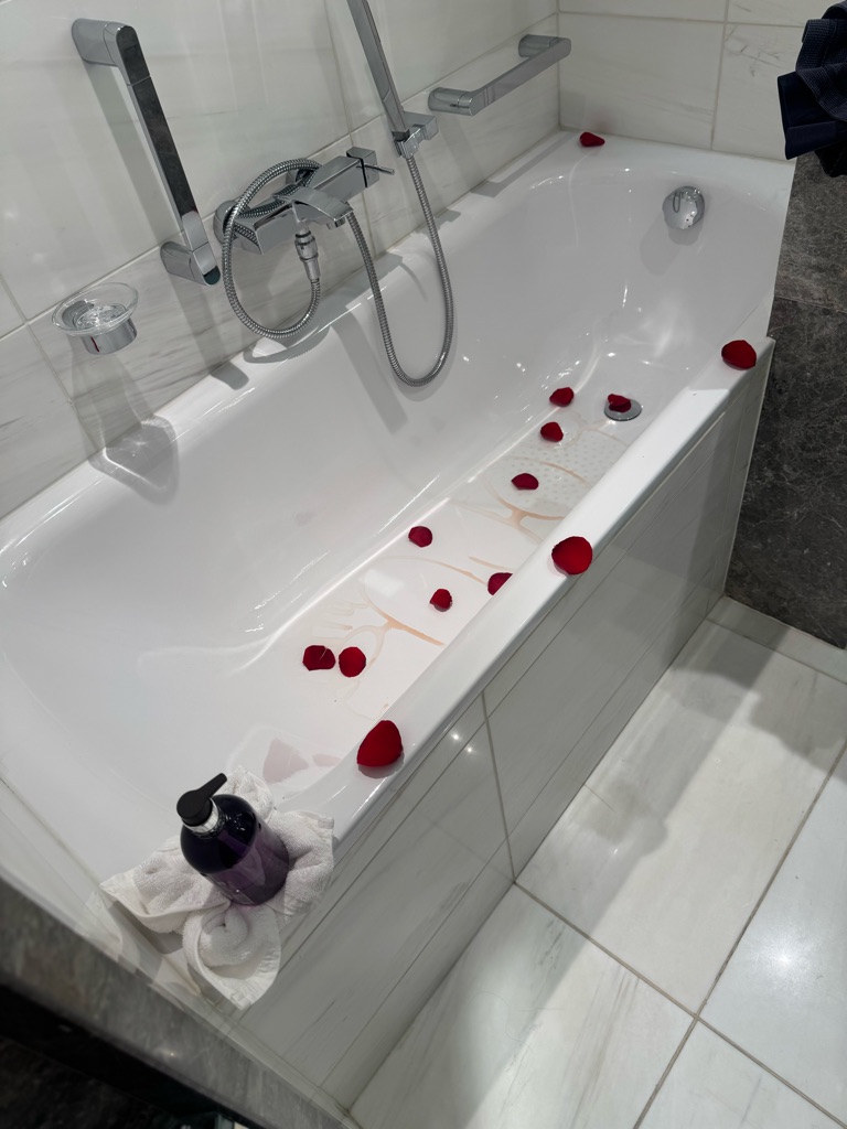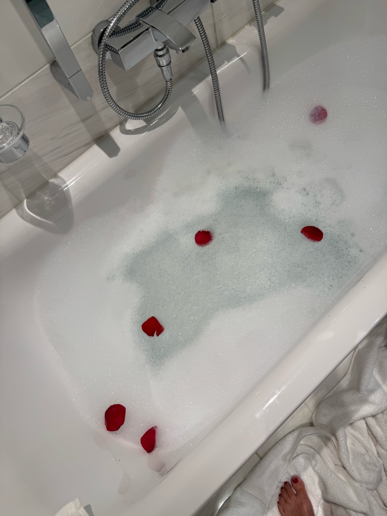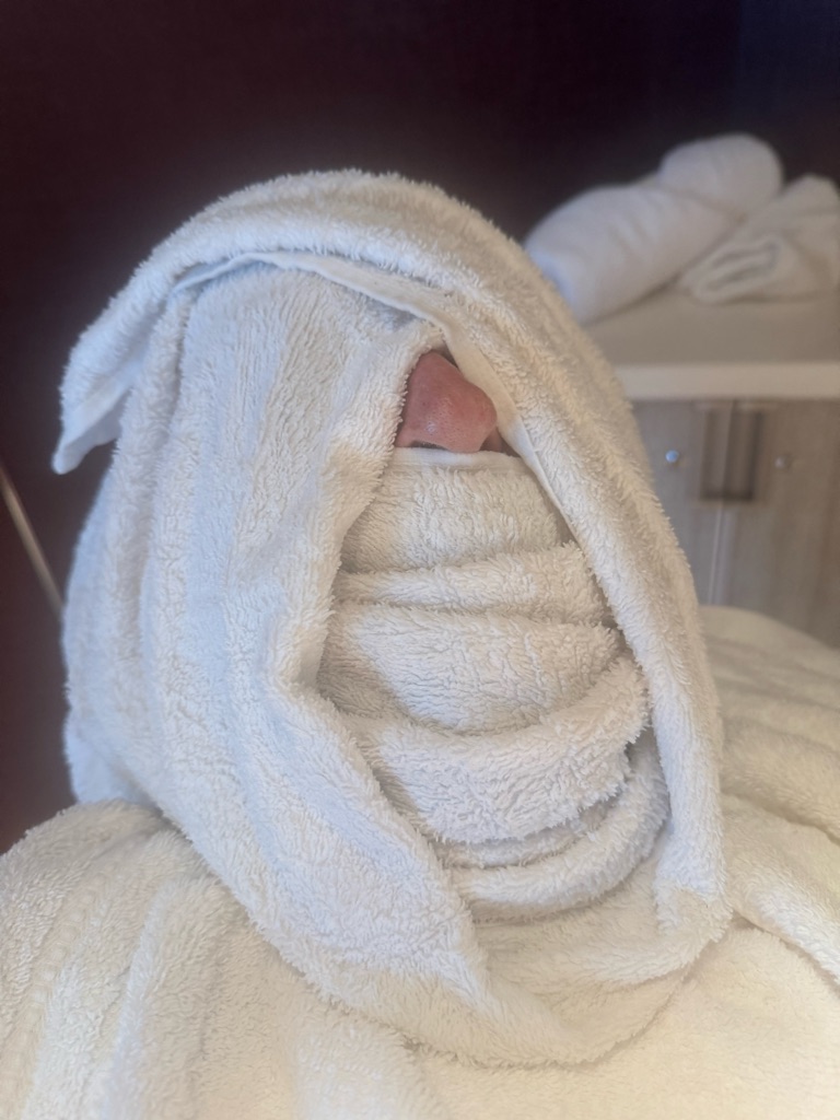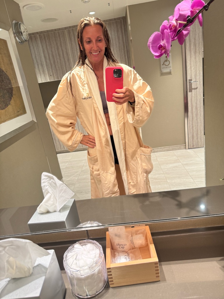 Immediately outside the steam room, there are these two showers that are really large and tiled and the rain shower above, I think it’s to get the salt scrub off. Then they have these warm massagers on the sides of the shower that spray horizontally. It is a heavenly experience. Needle laid in the serene room and the heated bed, and I went to the women’s changing room and took my normal every day shower. I left with a robe because I didn’t have a change of clothes other than my swimsuit.