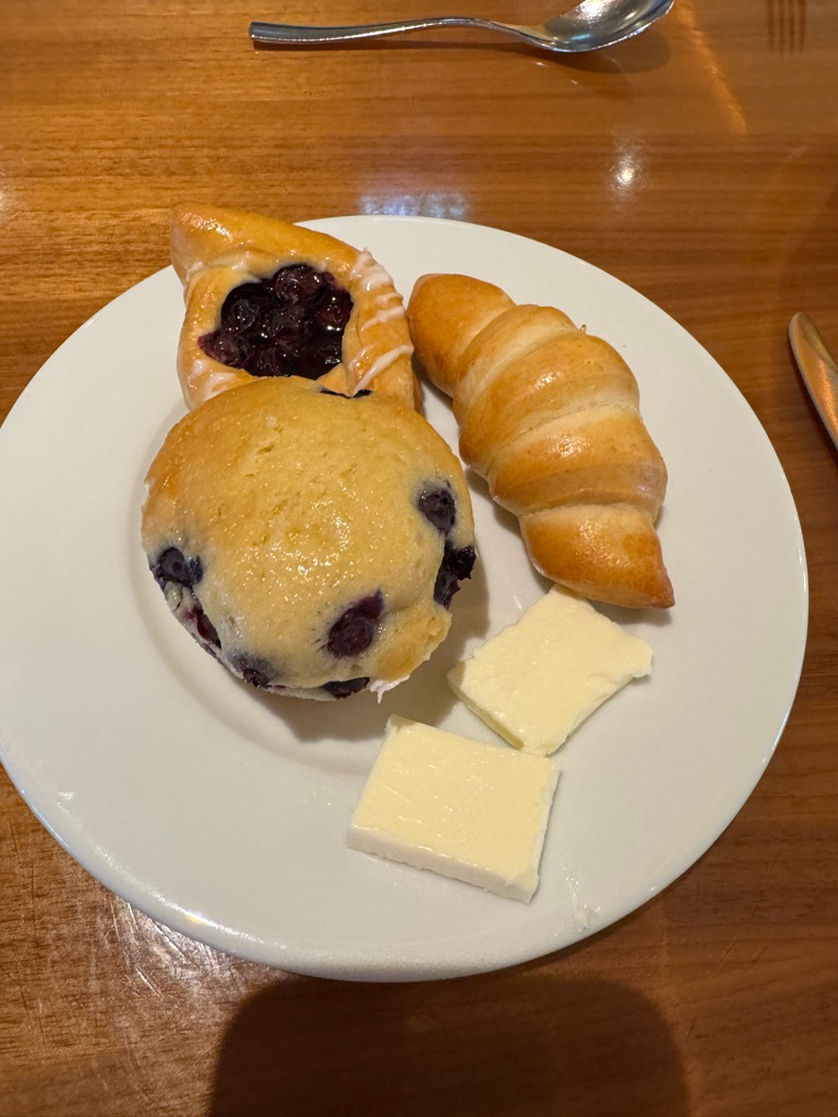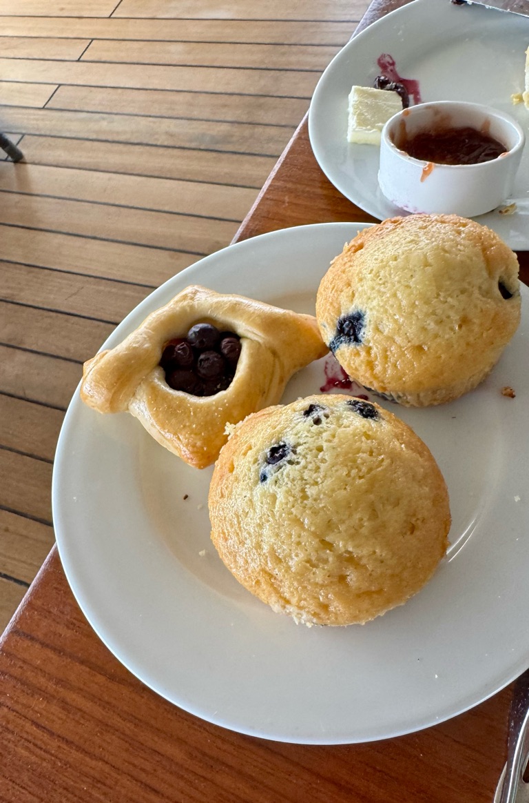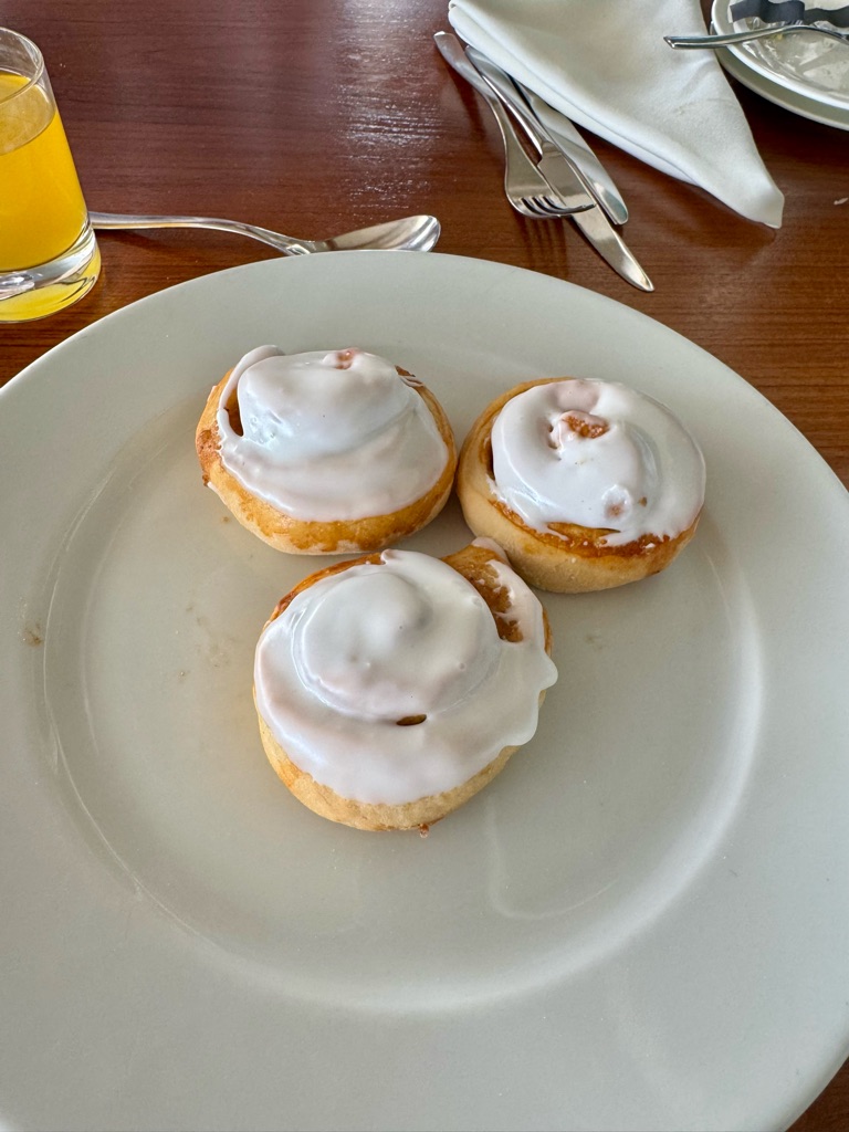 So today when \240we finally got up, we went outside and laid at the pool in one of those very comfy duo lounge chairs with the cushions. We talked to people throughout the day that sat down next to us, many different people. We had lunch. I had chicken skewers and steak skewers and they brought us our muffins and cinnamon rolls heated! We had those first with coffee. Needle ordered a burger for lunch and I brought my chicken and steak skewers over to the lounge chair area. We had our coffee there with our pastries and our lunch there as well.