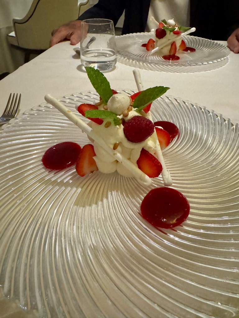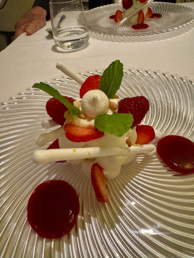We started with tuna a Greek salad and tzatziki sauce. They brought a gluten-free bread and breadsticks. The dessert was the best part as you can see it was covered in meringue and strawberries.