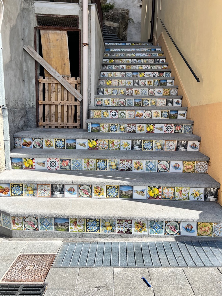 3 levels of terraces covered in flowers with a friendly little old lady watering plants and greeting us