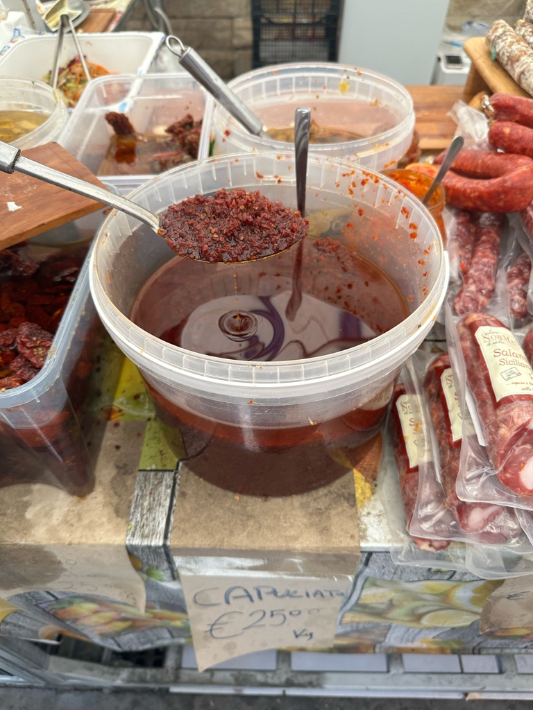 Sun dried tomatoes, capers, olive oil almonds and pistachio. Pin pasta or on bread with grated pecorino and lemon zest