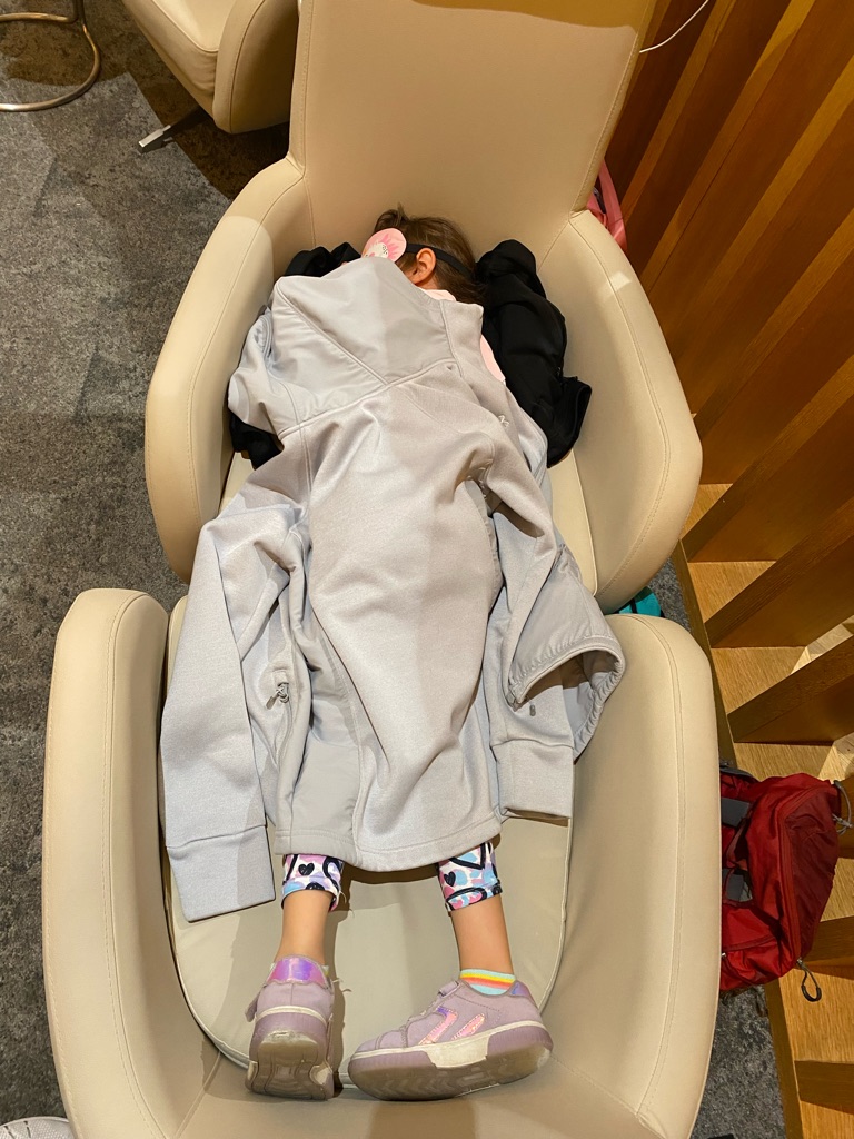 Trying to let Lydia sleep in the lounge since our flight didn’t leave until 11:50pm Vancouver time (1:50am Winnipeg time)
