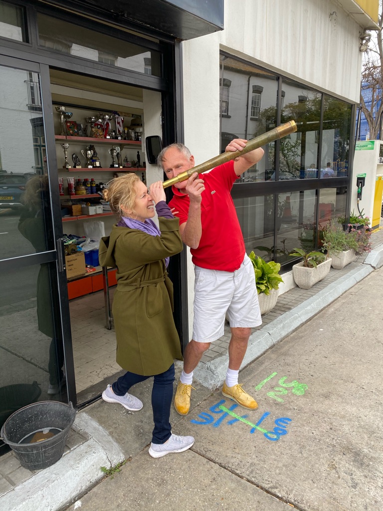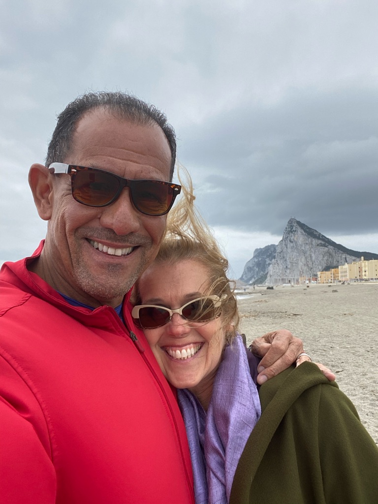 As locals gassed up their scooters and tiny cars, Walter (our newfound service station friend) regaled us (well Mary) with his life story. He said he was seventy-five years old and was planning to retire the following week. He was excited to learn we (again Mary) lived in Rhode Island. He claimed he has a 99 year old aunt who lives in Rhode Island but was a Broadway actress. As a British soldier, he was detailed to Gibraltar, where he met his wife; consequently, he’s lived here ever since. We’re not sure how he ended up running a tiny gas station in the heart of Gibraltar but we suspect it had something to do with his wife wanting him out of the house. The tiny station office was chock full of photos. He claimed he was the past-president of the Gibraltar running club (photos showed him with a group of runners) and that he had won the British Navy’s version of the decathlon. Surprisingly, he was still in remarkable shape. There were photos of his son, who was also a runner, with Usain Bolt \240and pictures of Walter and his sons racing cafe style motorcycles. Walter fancied himself the best tour guide in Gibraltar and claimed he often conducted tours dressed as Lord (Admiral) Nelson (hence why the gas station was often closed). He showed us (again Mary) newspaper clippings and photos of him dressed as Nelson. He also should us photos of him with Prince Andrew. When Price Andrew toured Gibraltar, Walter was his guide (I didn’t have the heart to ask if this was pre or post Epstein). He claimed he had an original sword belonging to Nelson and brought out a carefully wrapped telescope, which he claimed belonged to Nelson. Although he claimed it was priceless, he unwrapped it because he wanted us (well AGAIN Mary) to look through it. I just wanted the freaking car fixed so we could get back on the road. Eventually, we bought a gallon of coolant and headed back to the Spanish coastline.