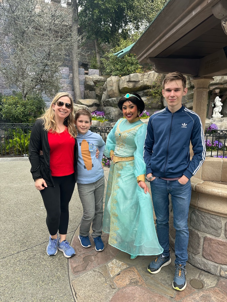 Then Rob met up with us and we went on Snow White and the Tea Cups. \240Our tour of Fantasyland continued with Pinocchio’s Daring Journey and a train trip down memory lane on board Casey Jr. \240From there we shifted gears to space and got to fly the Millenium Falcon to financial success on a dangerous Smuggler’s Run. \240After walking through Sleeping Beauty’s Castle on our way to lunch a Pizza Port, we stumbled upon Jasmine and got a quick and easy photo opp!! \240