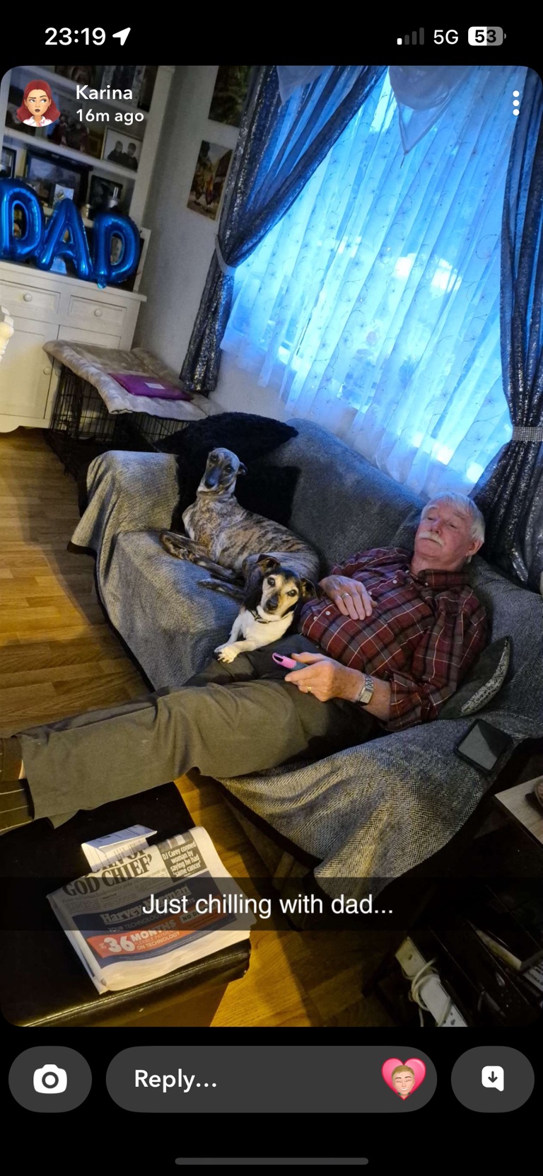 At home the dogs having a lovely time with grandad Liam!!
