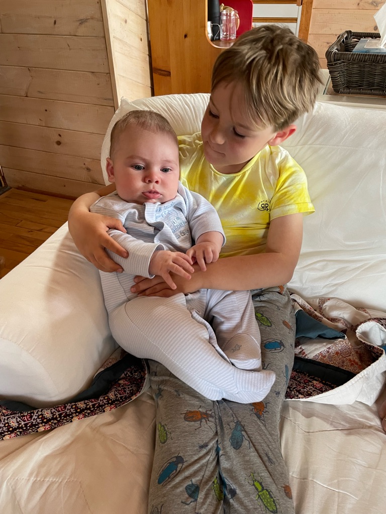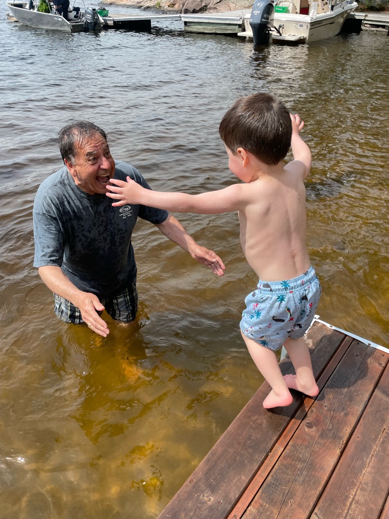 To see my grandchildren all stand on the dock, wrapped in their towels, shaking and shivering, lips quivering, one bare foot chasing away a horsefly on the other calf makes me smile. Just like their Moms. The whoops and hollers with their first fish, first swim, first jump off the dock, dive, driving the boat! So many firsts! COVID shots!!
