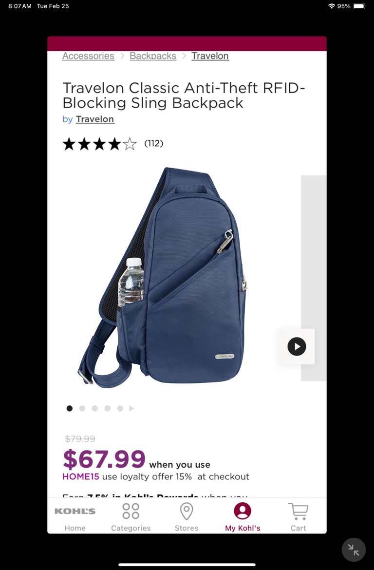 In addition to my travel backpack, I wanted a small bag to carry on our daily outings. \240I’ve ordered probably 10 different bags but ended up returning this one. It has wonderful antitheft qualities and I think it’ll hold exactly what I want to use on our daily walks. I didn’t like the fact that I would have to swing it around all the time or wear it on the front which isn’t comfortable for somebody who doesn’t like things in the front of their body on their