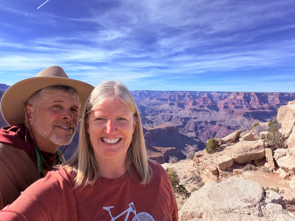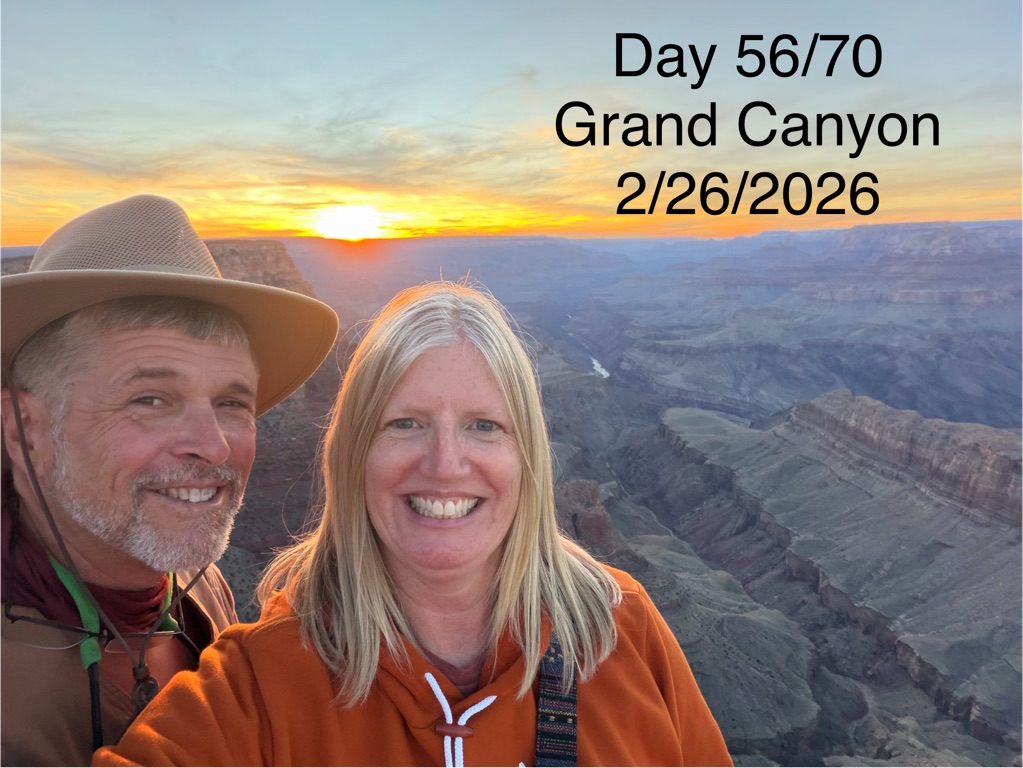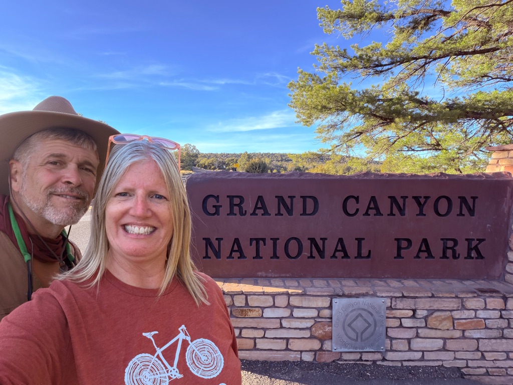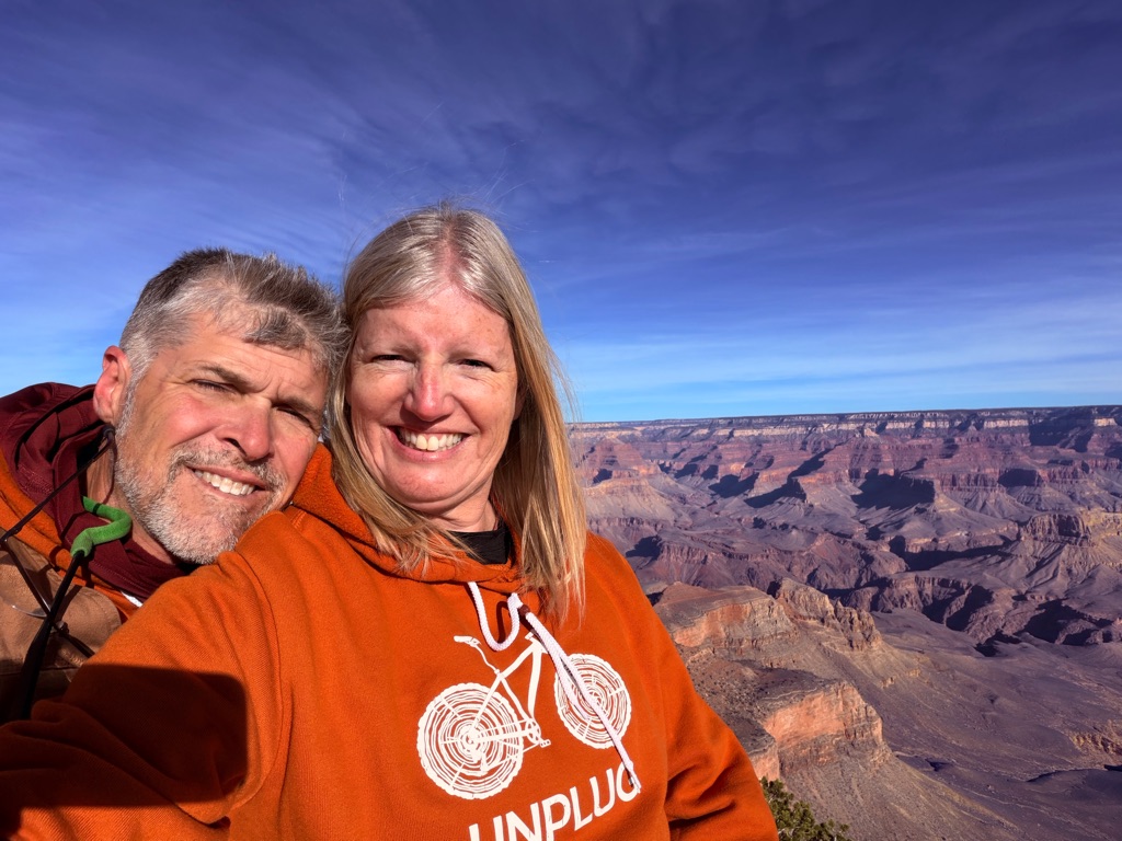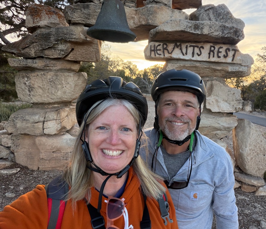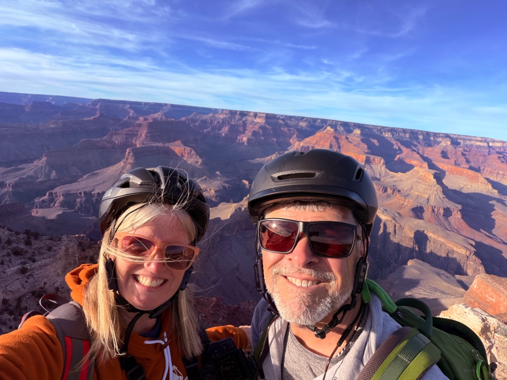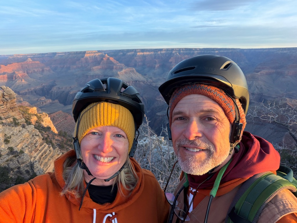 The alarm went off at 4:10AM so we could be out the camper door (in Williams, AZ) by 4:30AM, so we could arrive at the Grand Canyon at 5:30AM, so we could bike to our spot by 6:00AM for the 7:02AM Grand Canyon Sunrise, and it was soooo worth it!