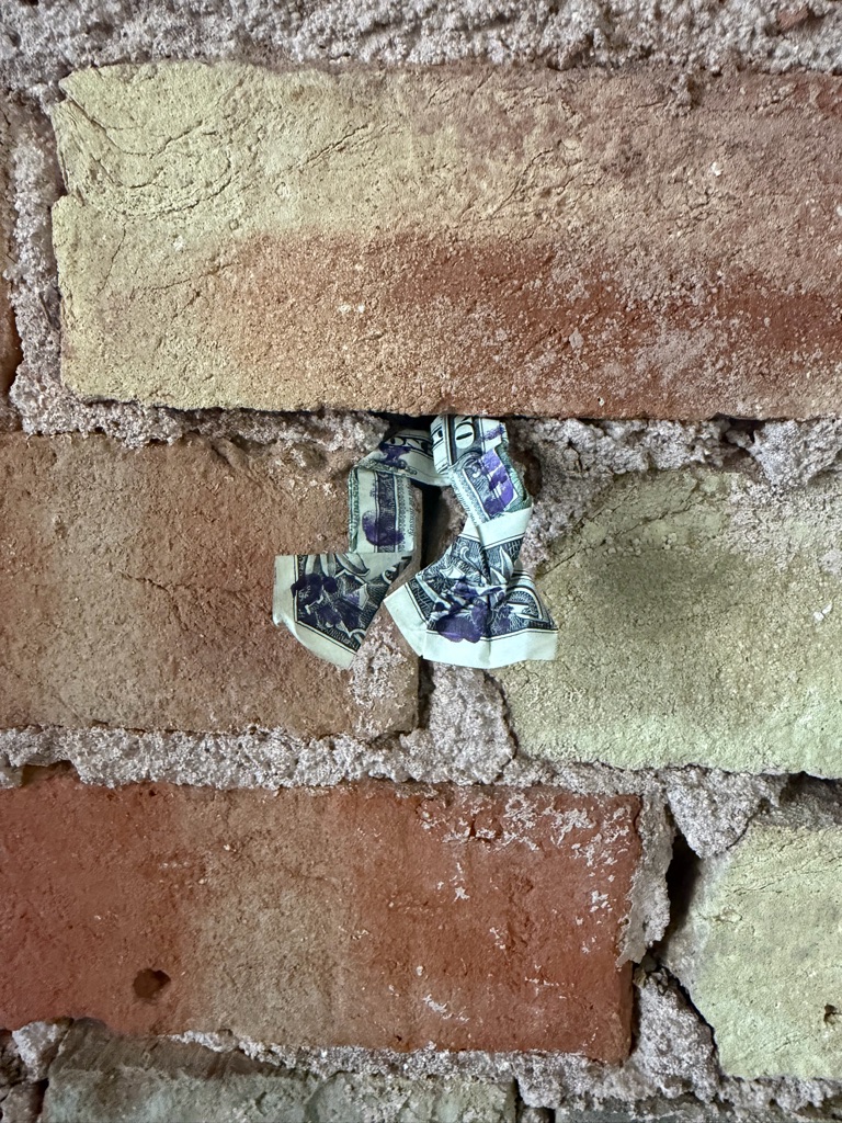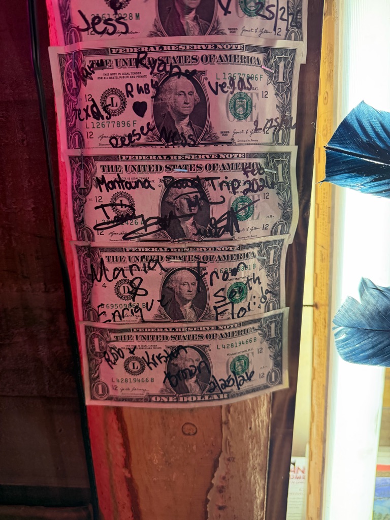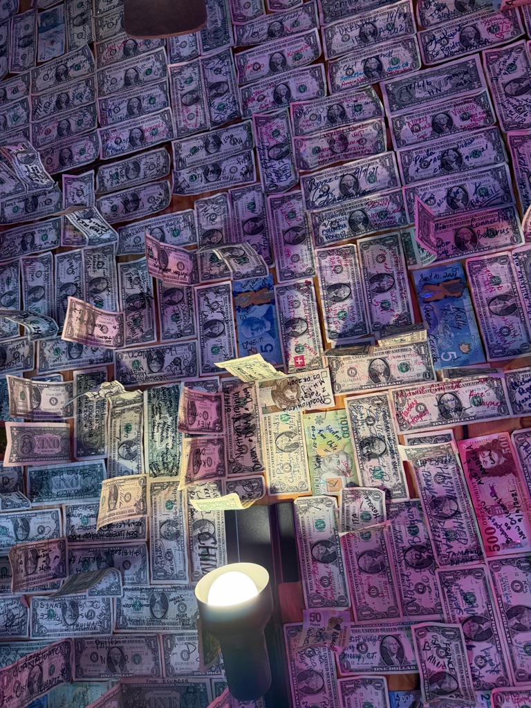 We had lunch at Flatbed Cafe and customers made origami out of dollars and left them in the wall, so we tried to also!