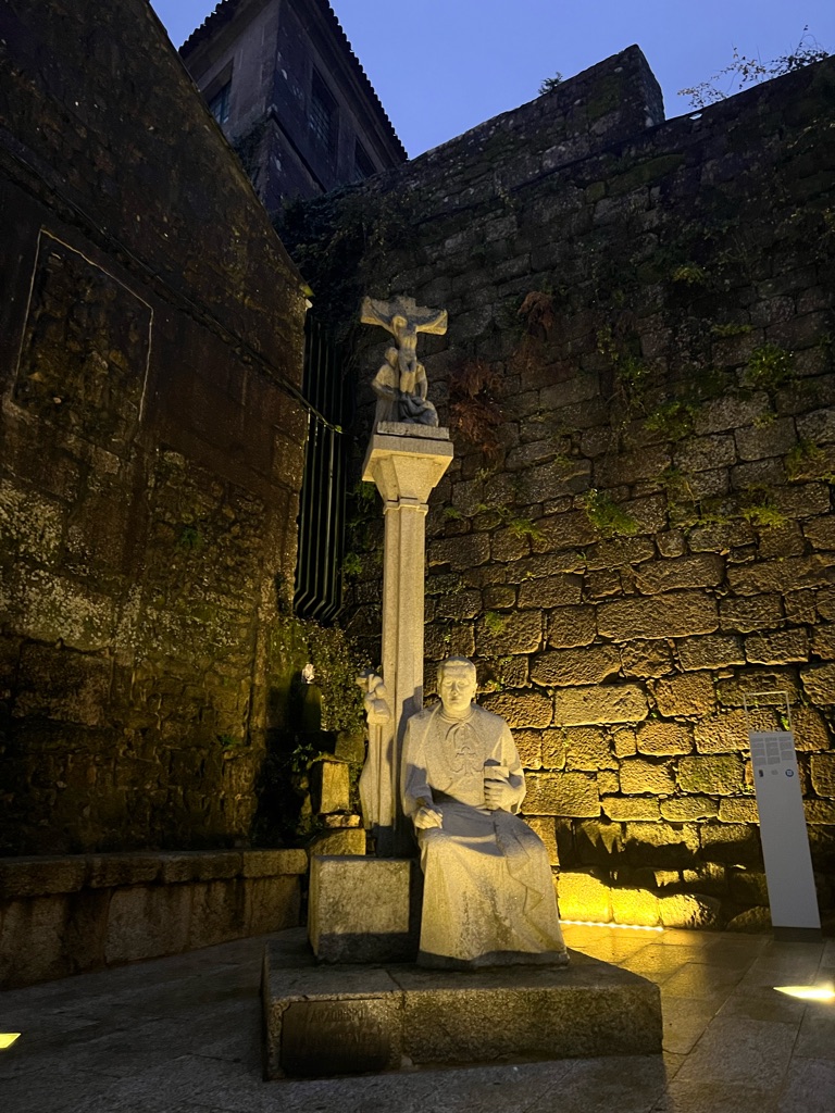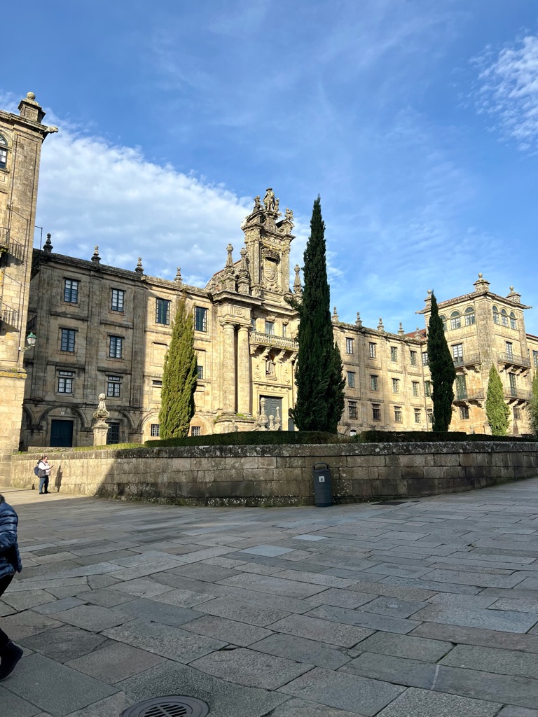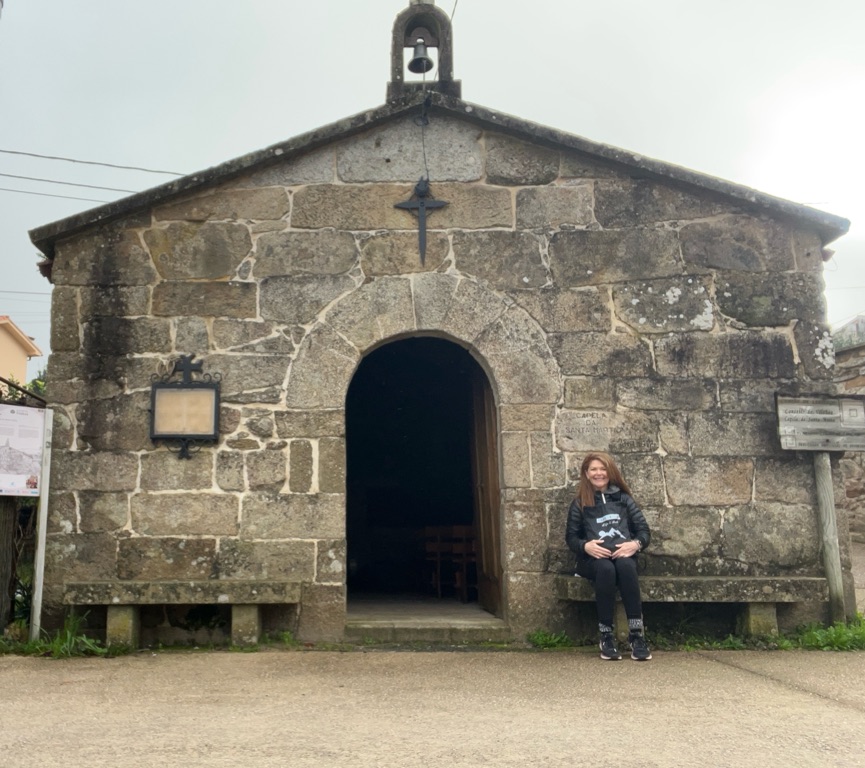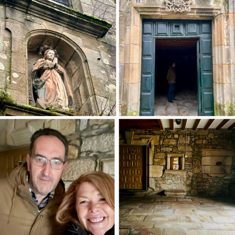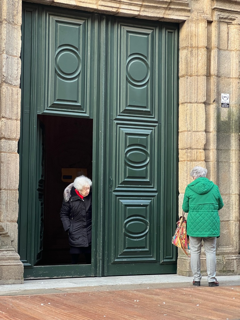 Real Panic set in this morning when I realized that there is not only anyone at the hotel doing this Camino thing, but likely no one in town & no one to check in with! The hotel proprietor escorts me out the door to the town square where he kind of nudges me in a direction. In shock, I wander in the rain for a bit trying not to freak out, I find a blog on line that seems promising, & ask a man on the street for directions. He speaks no English, but promptly tries to help, escorting me through the old town towards the needed street. He suddenly stops at a convent where one can speak to nuns through the wall (like confession).He ushers me in, waits with me, \240introduced me to an 80 year old nun behind the screen & explains that the nuns sell baked goods to raise money. I buy something, and tell her my story as we chat -birthday/husband/ doing the Camino solo-in Spanish & start to cry. She tells me to wait & because I can’t see her, I’m not sure if we are praying or what, so I stand still until she returns bringing me a prayer card sweetly assuring me to just remain tranquil & everything will be ok. 😊